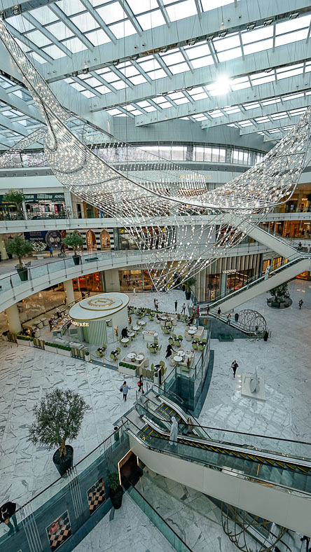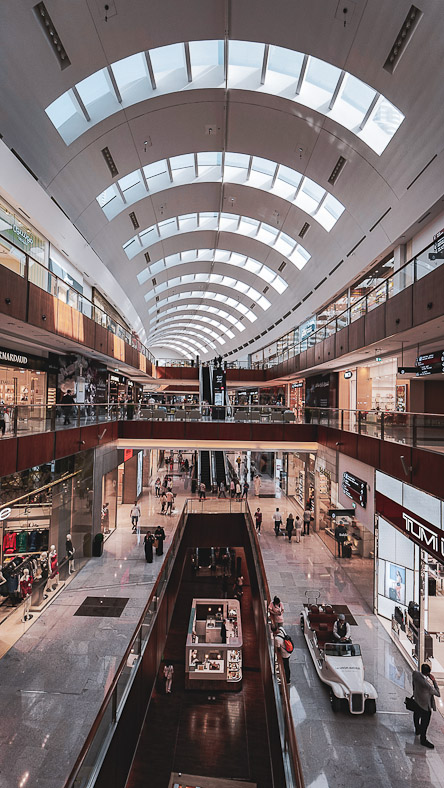 Die Shopping Mall ist eine weitere Attraktion, die Zeit und Geduld erfordert. Die Dubai Mall ist mit 350 qm Verkaufsfläche eines der grölen Einkaufszentren der Welt. Der 1200 Geschäfte und mehr als 1400 Parkplätze finden hier Platz. Für den Besuch sollte man schon 2- 3 Stunden zeit einplanen, den neben den zahlreichen Shops ist ein Aquarium und eine eigene Eisbahn sehr sehenswert. Für den kleinen Hunger zwischendurch gibt es auf einer Etage einen Foodcourt mit unzähligen Restaurants. Ihr könnt hier nicht nur Markenprodukte kaufen, sondern auch viele schöne Souvenirs kaufen. Nach der Tour in der Shopping Mall lohnt sich der Gang nach draussen auf den Platz vor dem Burj Khalifa. Täglich ab 18 Uhr bringt eine kostenlose Fontänen – Show die Besucher zum Staunen. Alle 30 Minuten schaut man auf eine stimmungsvolle Show mit Fontänen und Musik und verfällt ins Träumen. Besonders schön ist die Show in den Abendstunden.