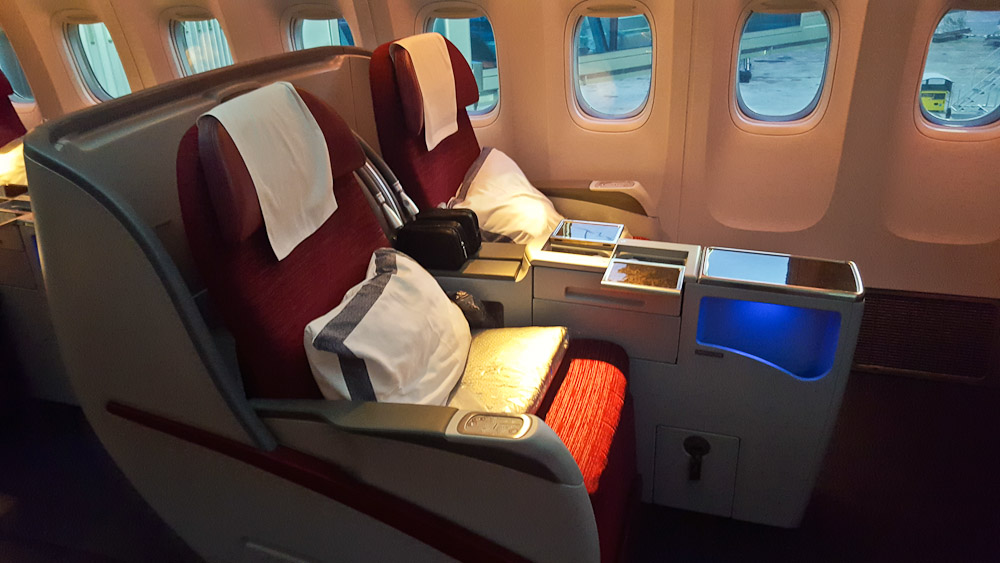 Ich bin jetzt einige Mal in der Business Class geflogen und freute mich daher auf den besonderen Service während des Fluges. Die Boeing 777 bietet ingesamt 42 Plätze in der Business Class, in der Konfiguration 2-2-2. Dir Aufteilung finde ich persönlich am besten, da man hier keinen direkten Mittelplatz findet.