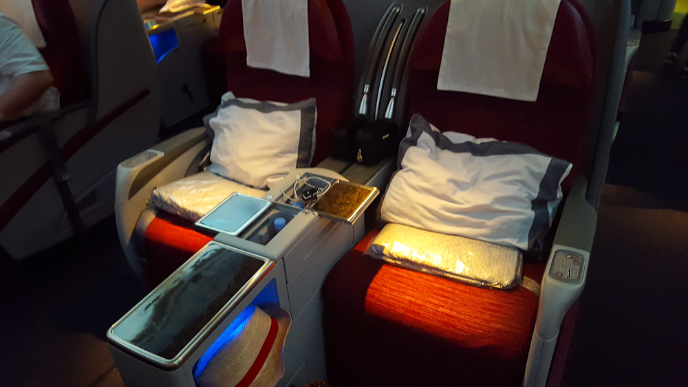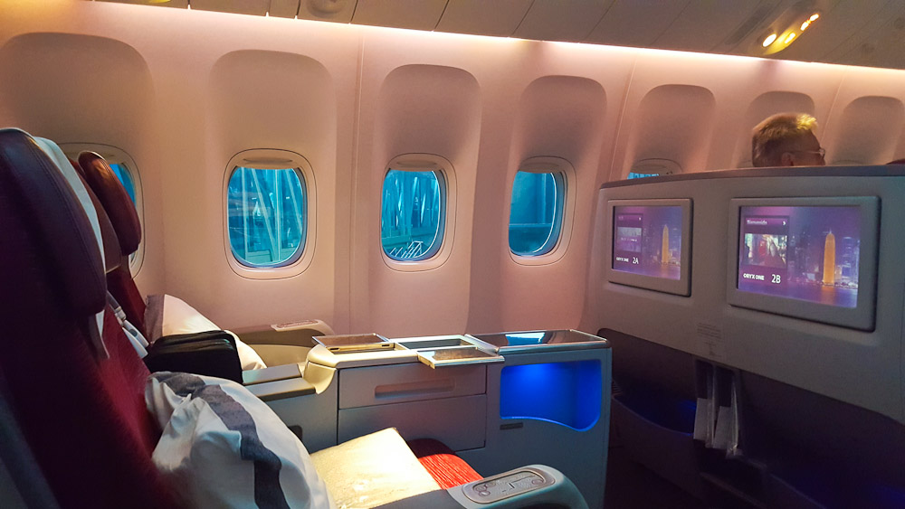 Der Flug von Denpasar nach Doha war ein Nachtflug, daher ist die Beleuchtung der Kabinen entsprechend dunkler und angenehmer. Hier kann man die Konfiguration der Sitze nochmal sehr gut sehen. Bei Qatar findet ihr zudem die Full-Flat Sitze, die eine 180 Grad Fläche bieten und damit waagerecht ohne Neigung ausfahrbar sind.