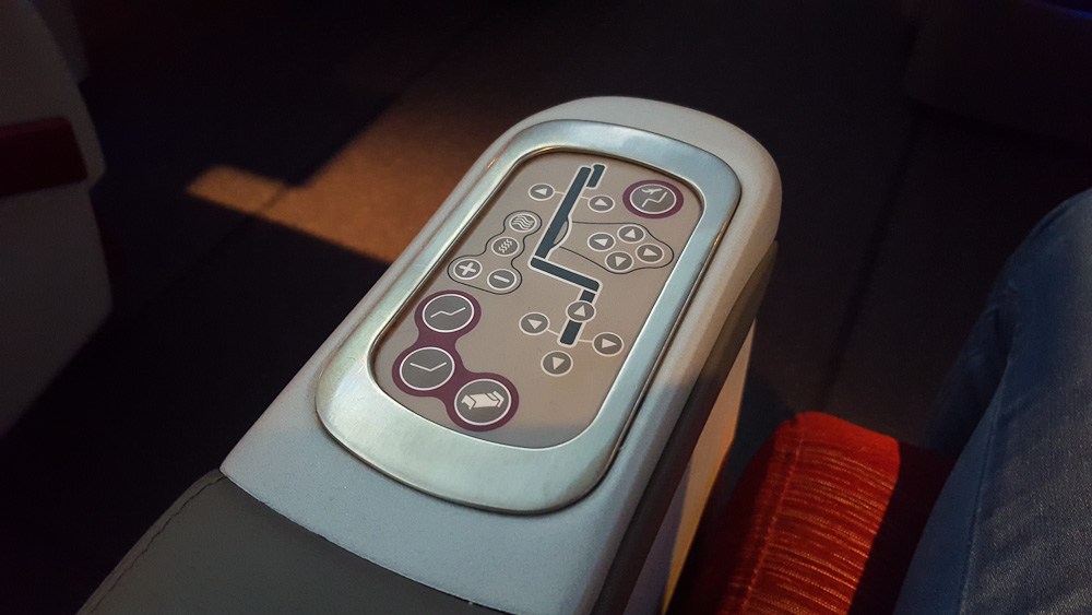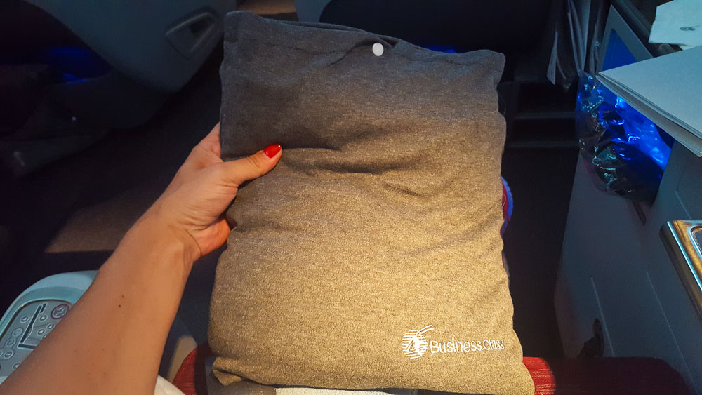 Die Sitze bieten euch im vorderen Bereich und an den Seiten genügend Platz zur Ablage sowie einen kleinen Schiebetisch für Smartphone u.ä. Dieses Mal war ich sehr überrascht, dass ich während des Nachtfluges zu dem weichen Kissen und der Bettdecke noch einen Pyjama bekommen habe. Vor dem Start gibt es noch ein Getränk nach Wahl und ein warmes Handtuch zur Erfrischung.
