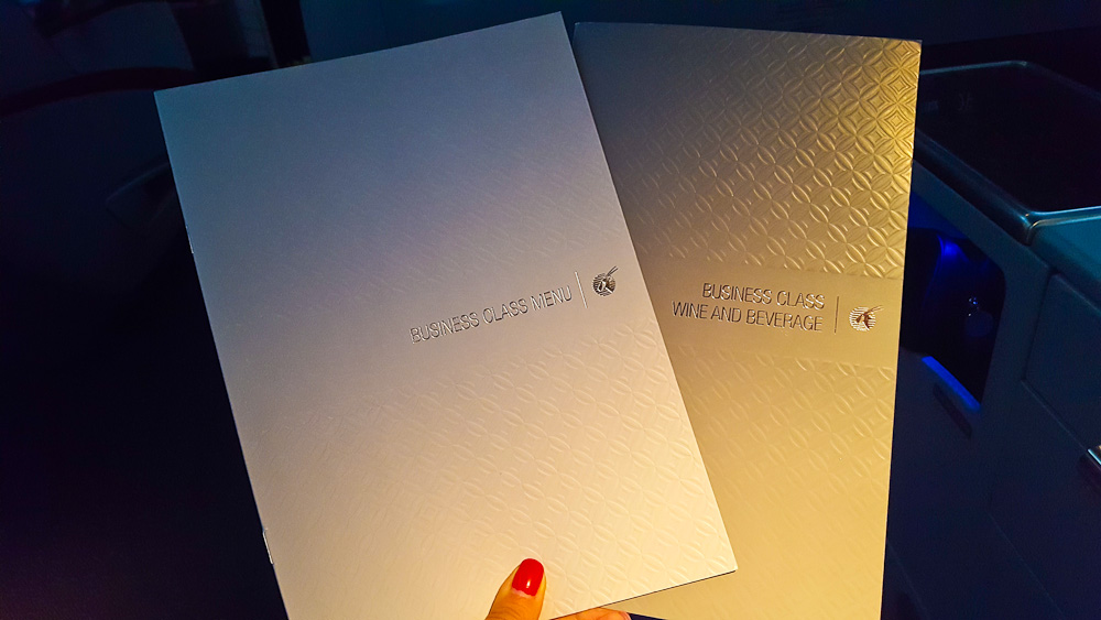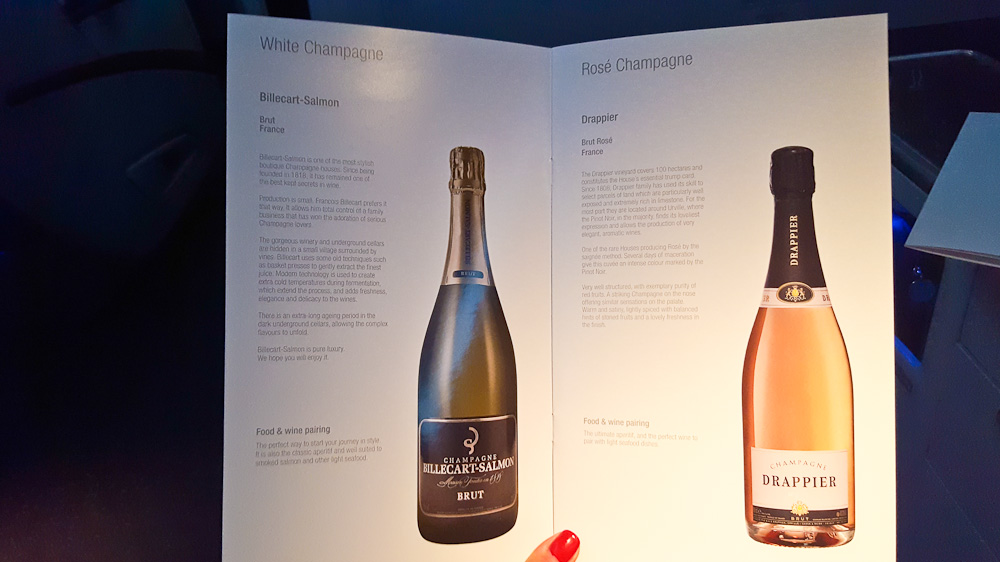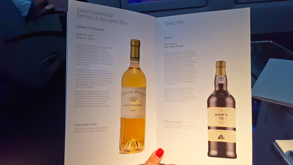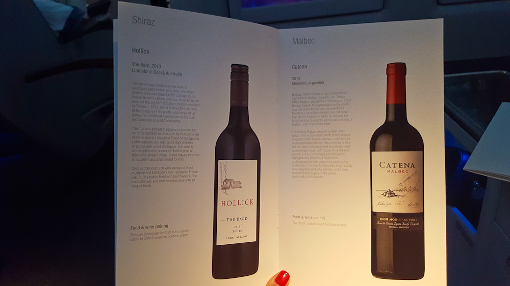 Einige Minuten nach dem Start wird schon die Menükarte verteilt und auch der Wunsch des Getränks zum Essen erfragt. Ich habe für euch hier einen Ausschnitt der Getränke Karte angefügt, da diese in der Business Class eine sehr gute Auswahl an Weinen und Champagner bietet.