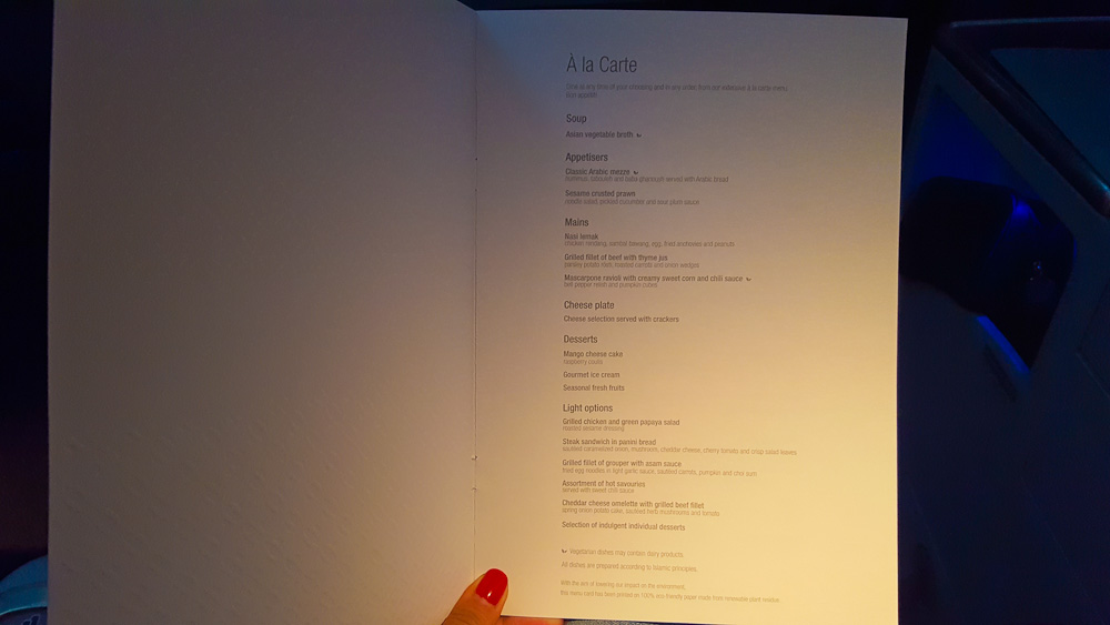 Das Essen wird als Menu serviert und kann individuell zusammengestellt werden. Es gibt hier auch vegetarische Gerichte, die für mich vielversprechend klingen, auch wenn ich kein Vegetarier bin.