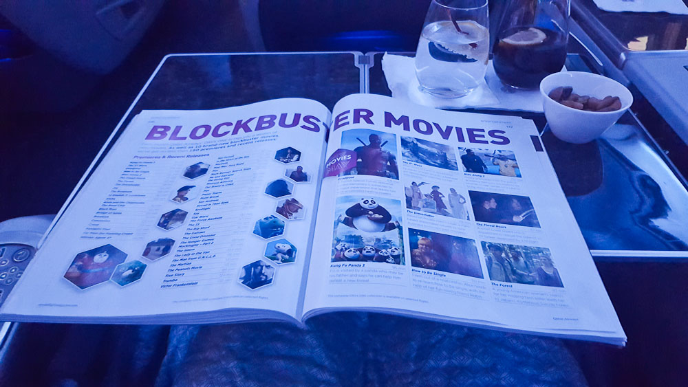 Jetzt kann es endlich losgehen und ich mache es mir gleich gemütlich und schaue im umfangreichen Bordprogramm nach dem passenden Film. Für eine rauschfreie Unterhaltung sorgen die Kopfhörer, die sehr gut alle Aussengeräusche unterdrücken, so dass man sich tatsächlich auf den Film konzentrieren kann und für eine Weile vergisst, dass man im Flieger ist. Für mich war dieses besonders angenehm, da ich durch meine Flugangst bedingt sehr viel auf die Geräusche achte.