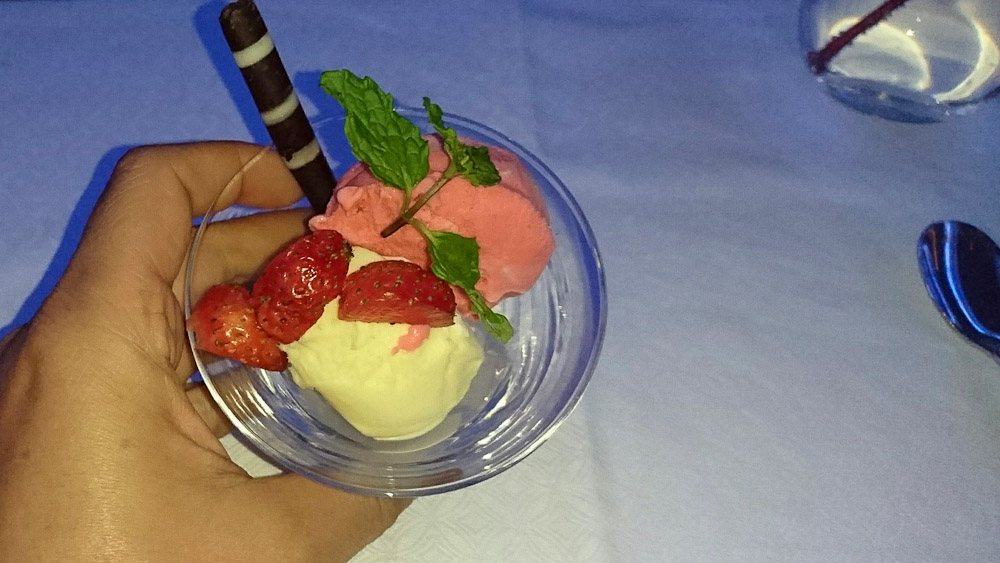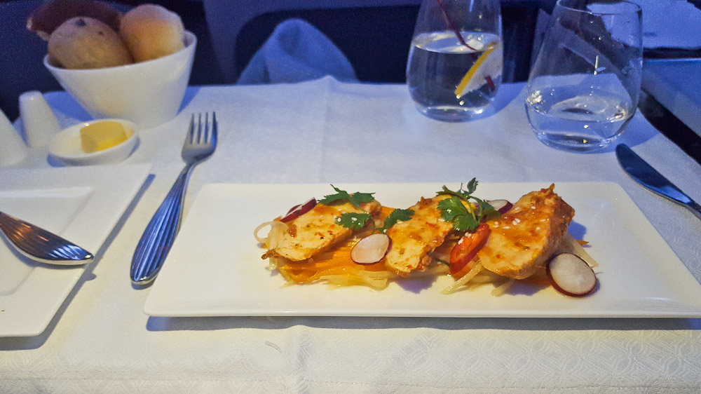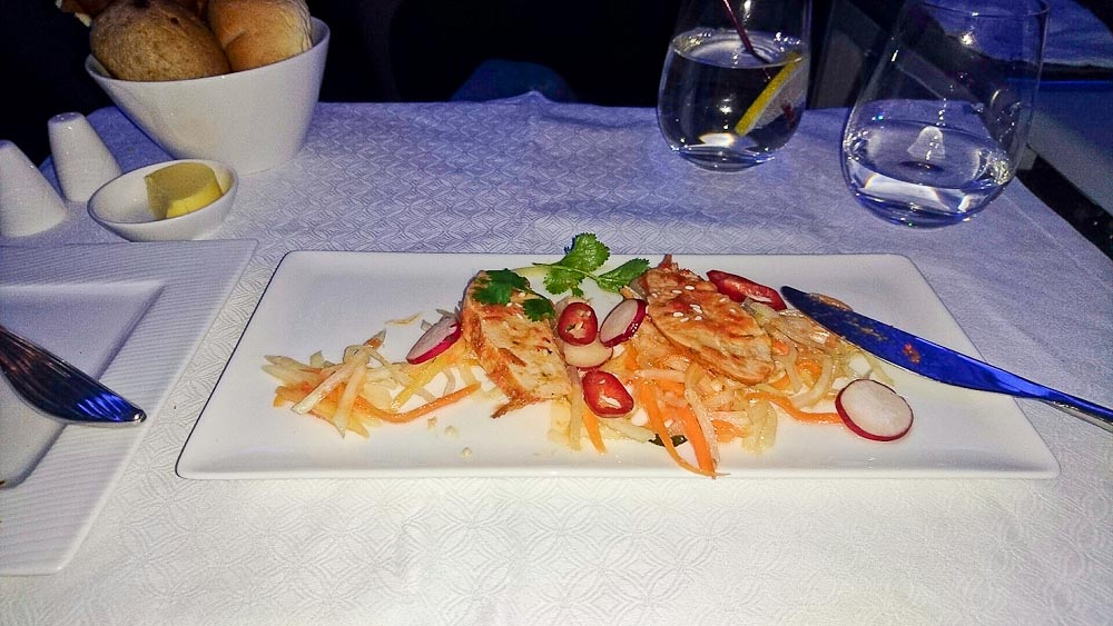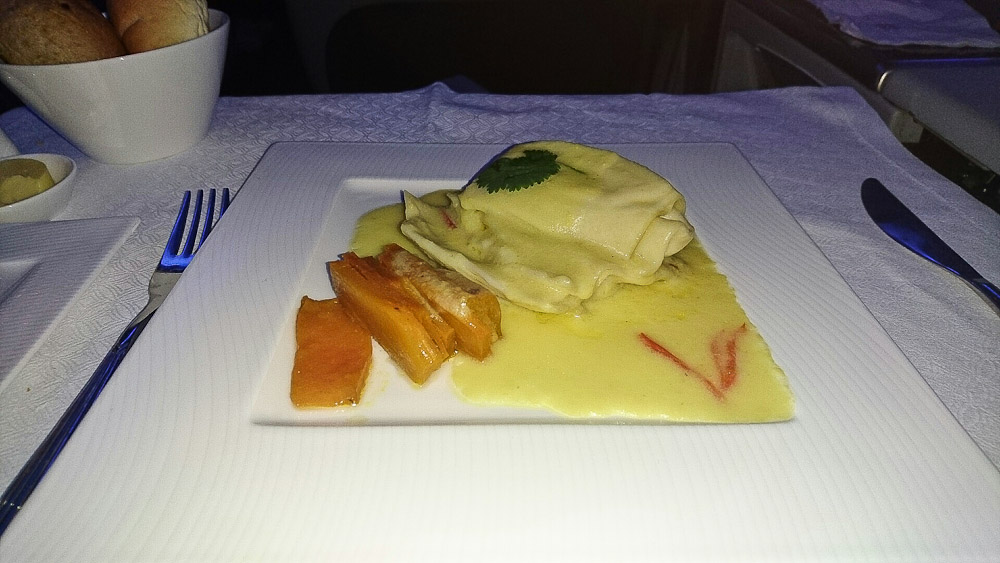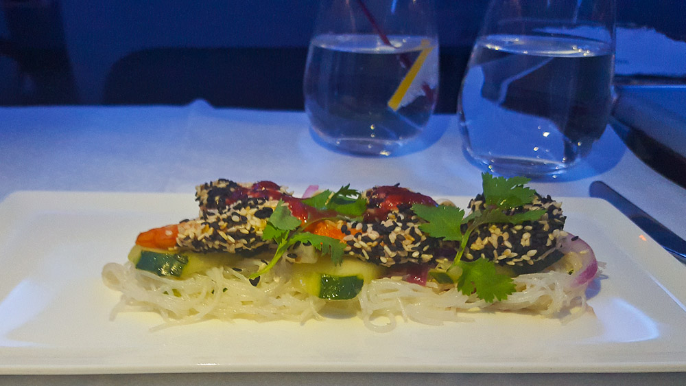 Ich habe mich bewusst für das vegetarische Hauptgericht entschieden, da oft diese Menus etwas vernachlässigt werden. Ich kann den Geschmack von den Krabben in der knusprigen Sesamkruste und dem leicht pikanten und frischem Salat immer noch schmecken. Meine Ravioli sieht vielleicht auf den ersten Blick nicht nach einem kulinarischem Meisterwerk aus (im Vergleich zu meinem Nachbarn, der das gegrillte Beef Filet hat), das liegt aber auch daran, dass es doch relativ dunkel war und ich ungerne mit dem Blitz meinen Nachbarn stören wollte, aber der Geschmack von Mascapone und der leicht pikanten Chili Sosse zergeht im Mund. Der Nudelteig ist weder klebrig noch zerkocht, einfach nur Al Dente!