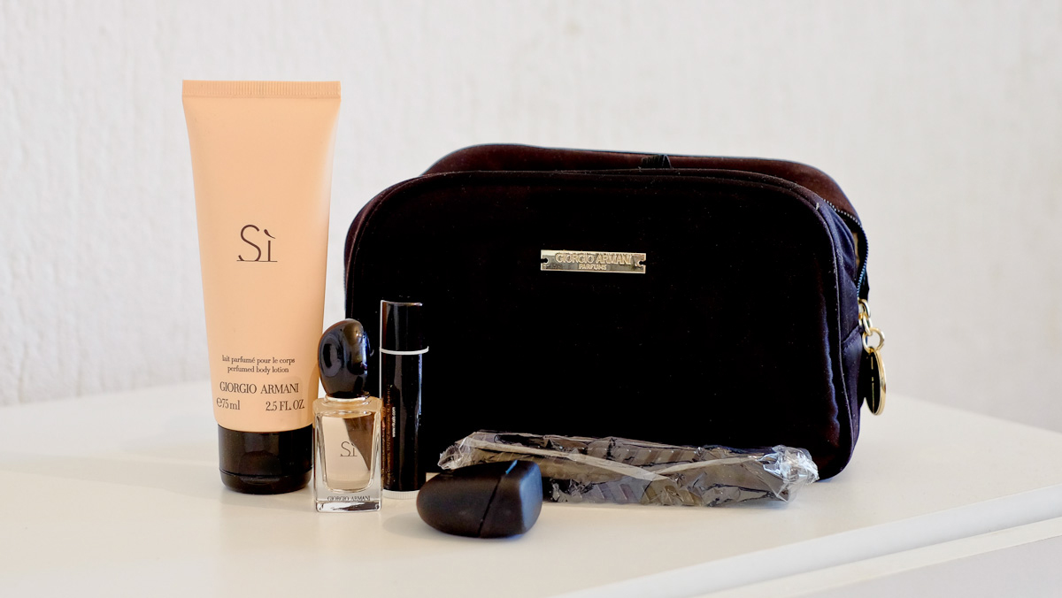Die Sitze haben alle ein integriertes Video-Audio On Demand System, USB Steckplätze zum Anschliessen von regulären Geräten und in der Mitte an der Verlängerung der Konsole eine extra Leseleuchte für die Nacht. Ausgestattet wird man in der Business Class hier mit einem Giorgio Armani Amenity Kit, welches zu der Schlafmaske, den Ohrstöpseln, den Söckchen noch einen extra Kamm bereit hält und eine Body Lotion + Mini Parfum der Marke Giorgio Armani sowie einem Lippenbalsam der Firma Rituals.