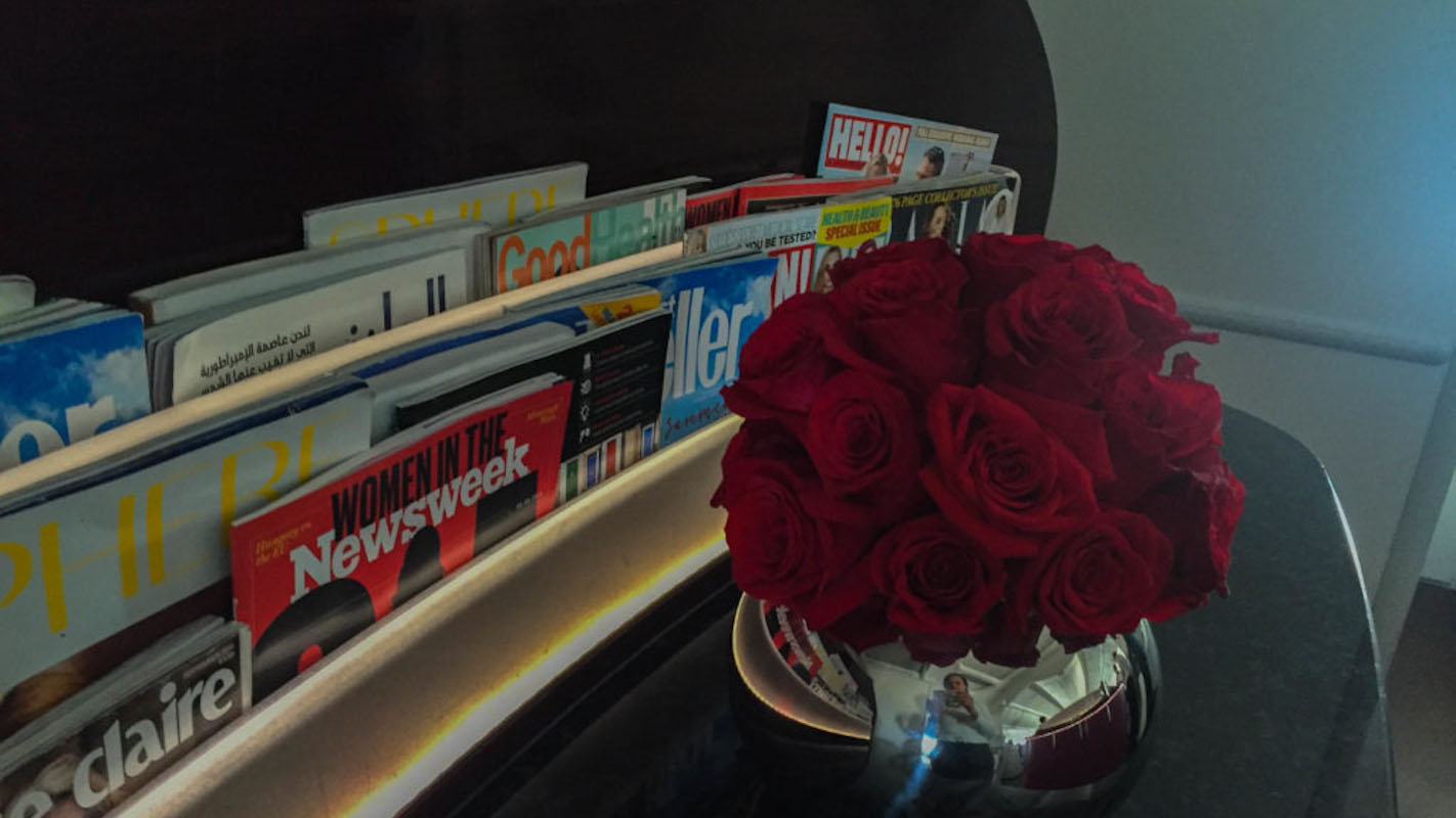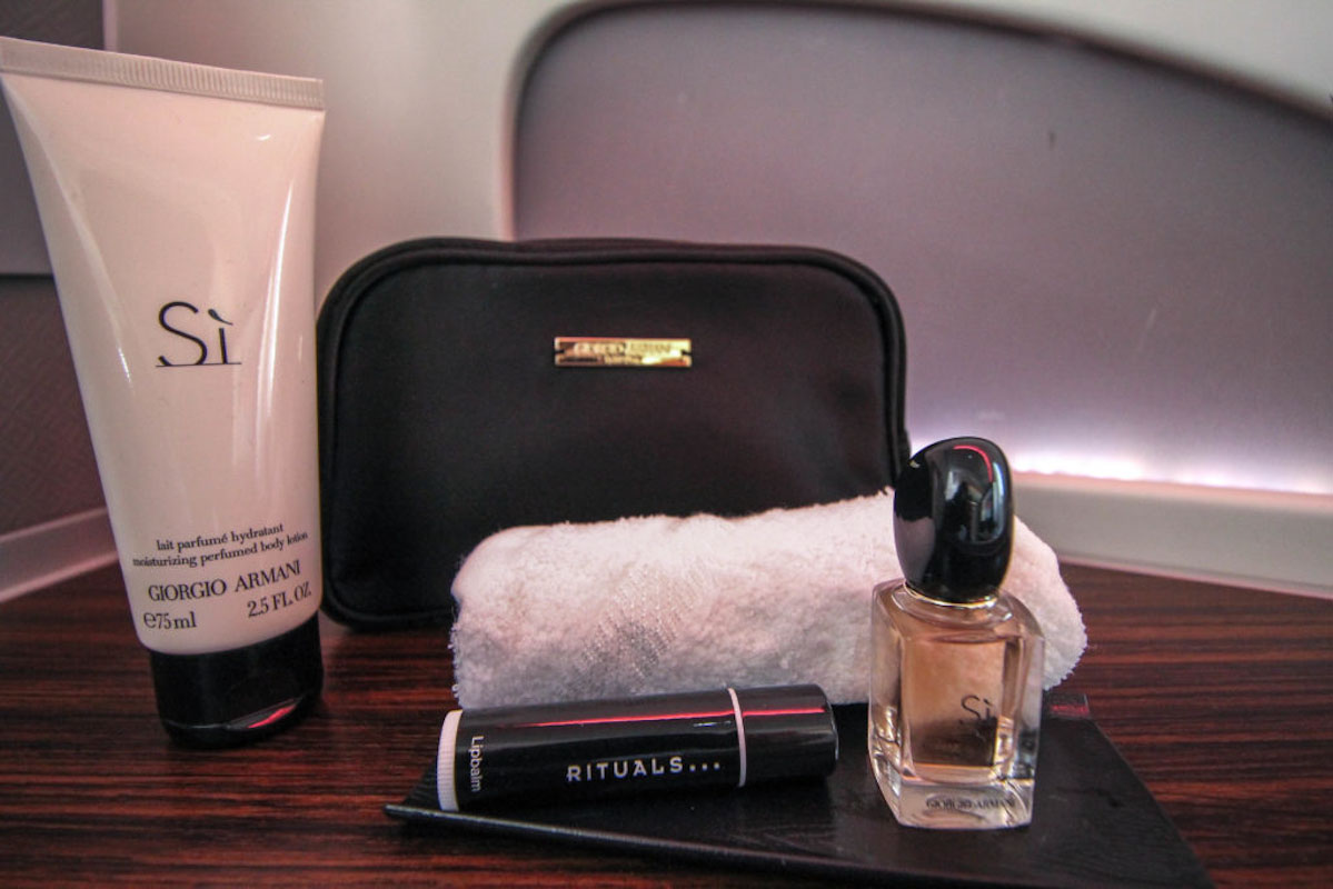 Wie ein Kleinkind an Weihnachten stehe ich vor dem 2 Meter langen und 0,77 Meter breiten Sitz und kann mein Glück kaum fassen. Auf meinem Platz liegt ein weiches Kissen, eine Steppdecke und in den Ablagefächer finde ich eine kleine Flasche Wasser, große Noise Cancelling Kopfhörer und ein luxuriöses Amenity Kit von Giorgio Armani.