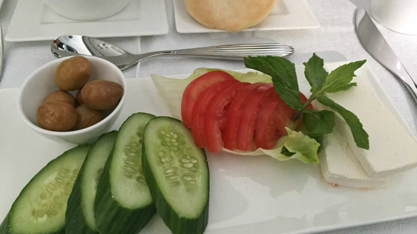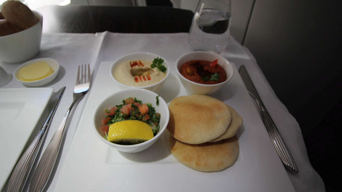 Nach einem spritzigen Limette-Minz Willkommensdrink und ein paar lecker arabisch gewürzten Nüsschen, studiere ich die Speisekarte für den Flug. In der Qatar Airways Business Class gilt das „Dine anytime“ Prinzip. Das bedeutet, ich wähle meine Speisefolge (es stehen bis zu fünf Gänge zur Auswahl) und die jeweilige Getränke Begleitung vorab aus, und kann selbst entscheiden wann die Mahlzeit serviert wird.