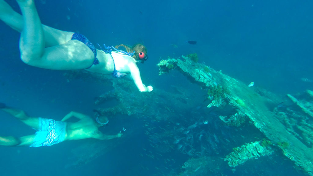 Das Schiff macht einige Stops zum Schnorcheln. Das Highlight ist sicherlich das alte Schiffswrack welches auch ohne große Tauchkünste knapp unter der Wasseroberfläche zur sehen ist. Der letzte Stop sorgt für die letzte Abkühlung auf dieser Tour. Die Gäste können sich hier von einer Plattform in Wasser stürzen. Hängend an einem Seil wird man hier nett vom Personal ins Wasser geschubst. Die Tour bietet definitiv jede Menge Spaß für die ganze Familie.