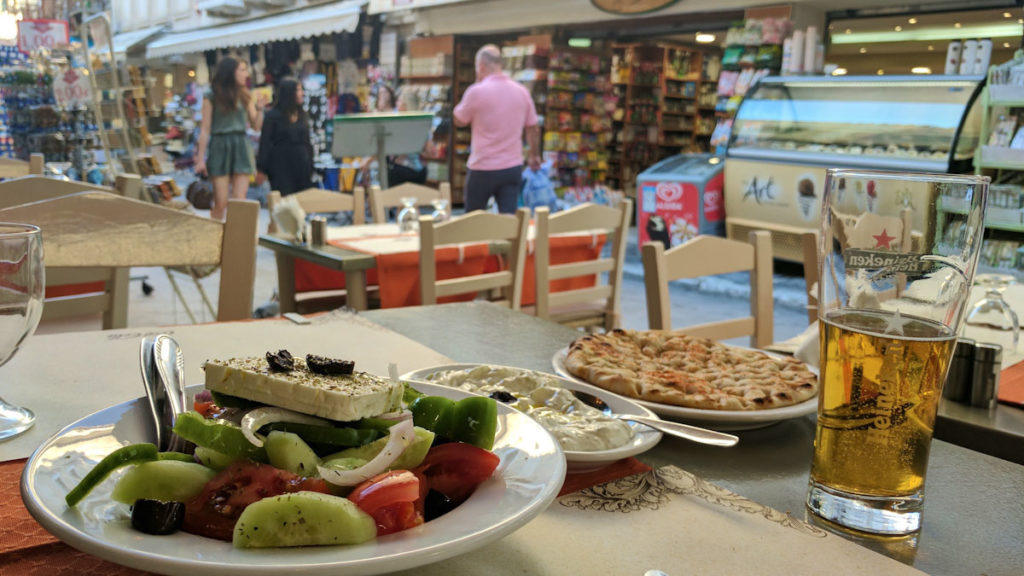 Ich habe in verschiedenen Tavernen, wo man schon beim Vorbeilaufen freundlich hereingebeten wird, zu Mittag gegessen und bin wirklich sehr positiv überrascht wie schnell das Essen gebracht wurde und wie einheitlich gut es war. Jeder Salat war tatsächlich gut angerichtet und mit den typischen Kräutern garniert. Beim Gyros Gericht könnt ihr teilweise zwischen Hühnchen oder Schweinefleisch wählen. Beides schmeckt einfach nur fantastisch gut..