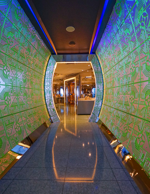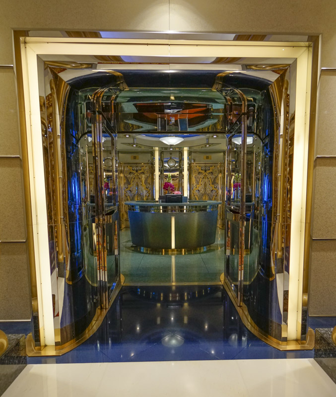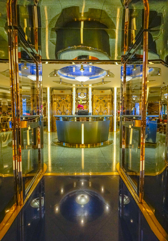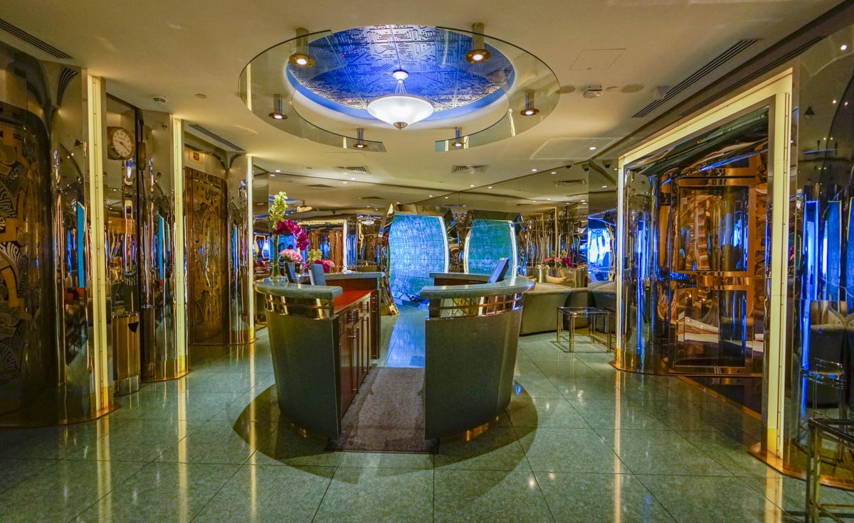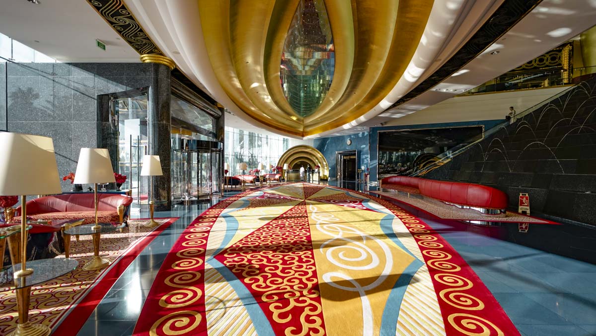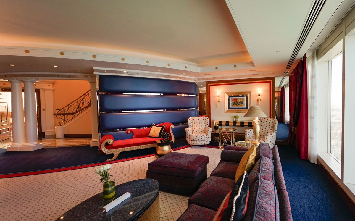 An Exklusivität wurde beim Burj Al Arab auch bei der Inneneinrichtung nicht gespart: Gold ist das optisch klar dominierende Element. So wurden neben 30 Sorten Marmor 1.800 Quadratmeter 24-karätiges Blattgold genutzt, um den Innenraum des Hotels auszuschmücken. Goldene, speziell für das Hotel angefertigte und mit Logo gravierte iPads stehen den Gästen während des Aufenthalts zur Verfügung. Und mit Gold on 27 gibt es im 27. Stockwerk eine Bar, die sogar ganz im glänzendem Gold erstrahlt. Dass auch der Cappuccino mit 24-karätigem Gold garniert wird, ist da doch eine Selbstverständlichkeit.