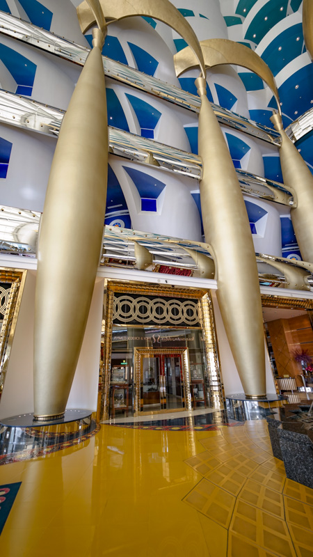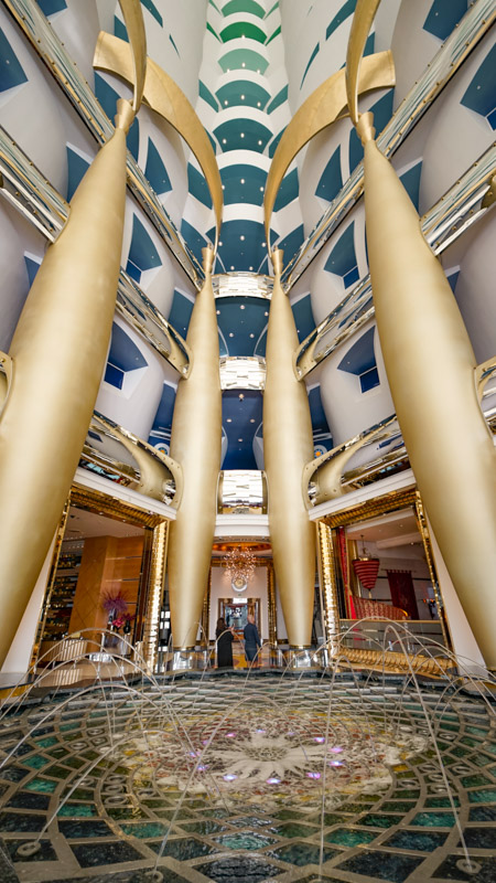 Das Burj Al Arab Jumeirah besticht vor allem durch seine atemberaubende Architektur, perfekten Service und herrlich luxuriöses Ambiente. Die segelförmige Architektur des Burj Al Arab Jumeirah war eine große technische Herausforderung für den Bau. 70.000 Kubikmeter Beton und mehr als 9.000 Tonnen Stahl wurden für die Errichtung des Turmes verwendet. Das Atrium des Hotels ist das größte der Welt. Es ist 180 Meter hoch (hier würde sogar die Freiheitsstatue hinein passen) und das Design sieht sehr futuristisch aus. Um den Innenraum des Burj Al Arabs auszuschmücken wurden 1.800 Quadratmeter 24-karätiges Blattgold und über 30 Marmorsorten wurden genutzt.
