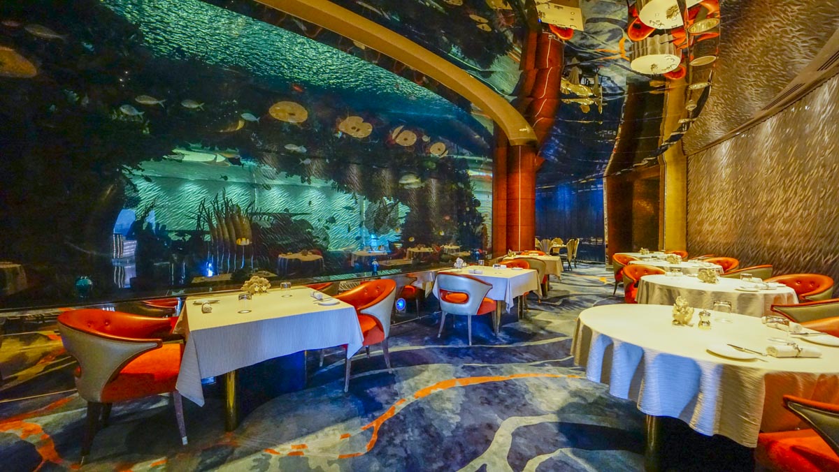 Nicht nur die Bauform des Burj Al Arab erinnert an die hohe See, auch im Inneren wird das maritime Thema fortgeführt und zwar mit spektakulären Aquarien wie man sie sonst nur aus Themenparks wie Seaworld kennt. Das Highlight ist ein 13 Meter langes Meerwasseraquarium im Inneren des Restaurants Nathan Outlaw At Al Mahara. Im Aufzug dorthin wird eine U-Bootfahrt simuliert und beim Verspeisen der Meeresfrucht-Spezialitäten an einem der rund um das Aquarium angeordneten Tische fühlt man sich tatsächlich wie in einer Unterwasserwelt.