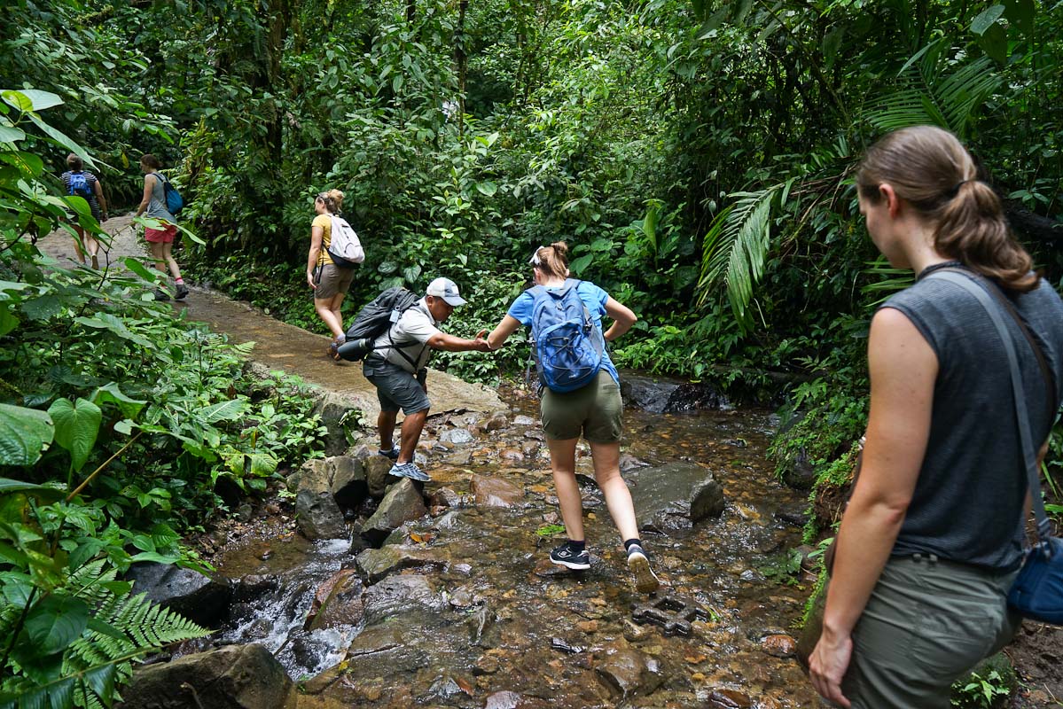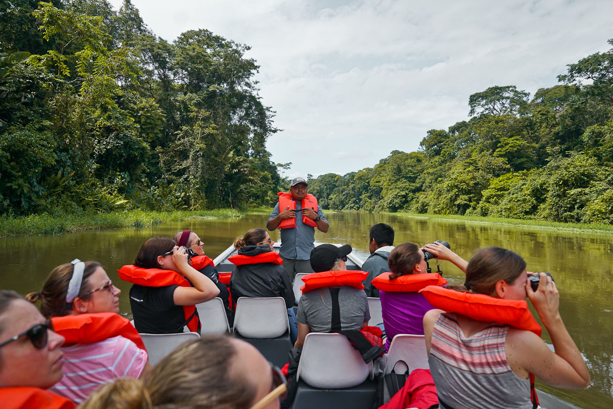 Die Reise beginnt in San Jose, wo sich die Gruppe das erste Mal trifft und auch Zeit hat nach dem langen Flug anzukommen. Den ersten Tag in San Jose kann man individuell gestalten und die Stadt erkunden. Hier gibt es keine Vorgabe oder geplanten Aktivitäten. Die Reise geht gemeinsam am nächste Tag in Richtung Tortugero Nation Park. Ein Fahrt mit einem Minibus und eine Bootsüberfahrt führen zu der Evergreen Lodge, die sich direkt zwischen dem Fluss und dem Karibischem Meer befindet. Die Fahrt mit dem Boot dauert ca. eine Stunde und ist bereits das erste Highlight der Reise. Der Nationalpark erinnert ein wenig an den Amazonas und auf dem Weg werden die ersten Krokodile gesichtet. Hier verbringt die Gruppe die nächsten zwei Nächte und erkundet bei einem Ausflug per Boot und Kayak die Tour. Die Lodge ist umgeben von tropischer Natur mit einem sensationellen Ausblick auf den Fluss. Die Abende geniesst die Gruppe mit einem Coco Loco Cocktail in der Hand und lauscht den Stimmen der Natur.