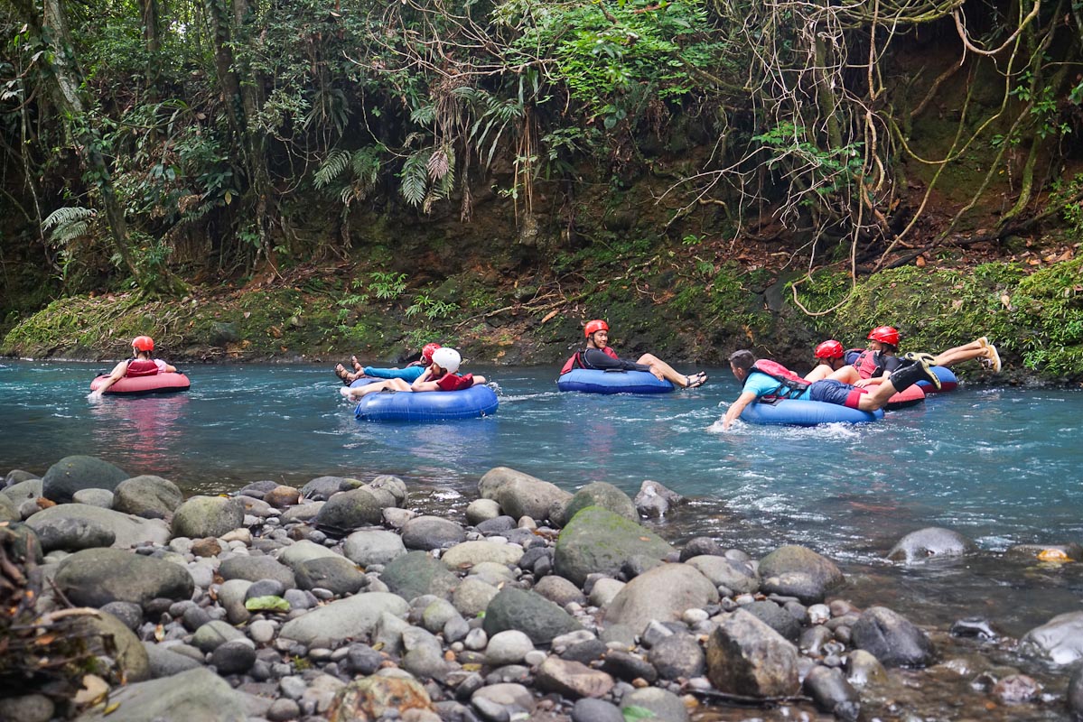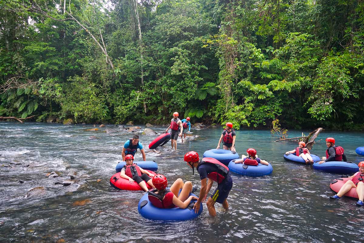 Das nächste Hotel möchte die Gruppe am liebsten gar nicht mehr verlassen. Die bisherige Auswahl der Unterkünfte konnte sich sehen lassen, jedoch ist das Rio Celeste Hideaway mit einem direkten Zugang zum Fluss sensationell. Die zimmer sind groß und sehr luxurious ausgestattet. Neben einer Outdoor Dusche, einem riesigen Himmelbett lädt die Terrasse mit gemütlichen Liegen zum Verweilen aus. Nur wenige Meter entfernt befindet sich der Rio Celeste Fluss, der auch zum Baden geeignet ist. Eine Erfrischung mit einer magischen Kulisse und kristallklares Wasser machen den Aufenthalt unvergesslich. Der Rio Celeste wird auch gleich am nächste tag für einen längeren Ausflug genutzt. Wildwasser Tubing steht auf dem Programm und trotz einiger Regentropfen macht dieser Ausflug richtig veil Spass. Über eine Stunde lang schwimmt man mal schneller mal langsam über den Fluss durch Stromschnellen und lässt sich einfach treiben. Ein Abenteurer mit einem sehr großen Spaßfaktor. Der Fluss ist sehr flach, so dass man unbesorgt das Abenteuer geniessen kann.