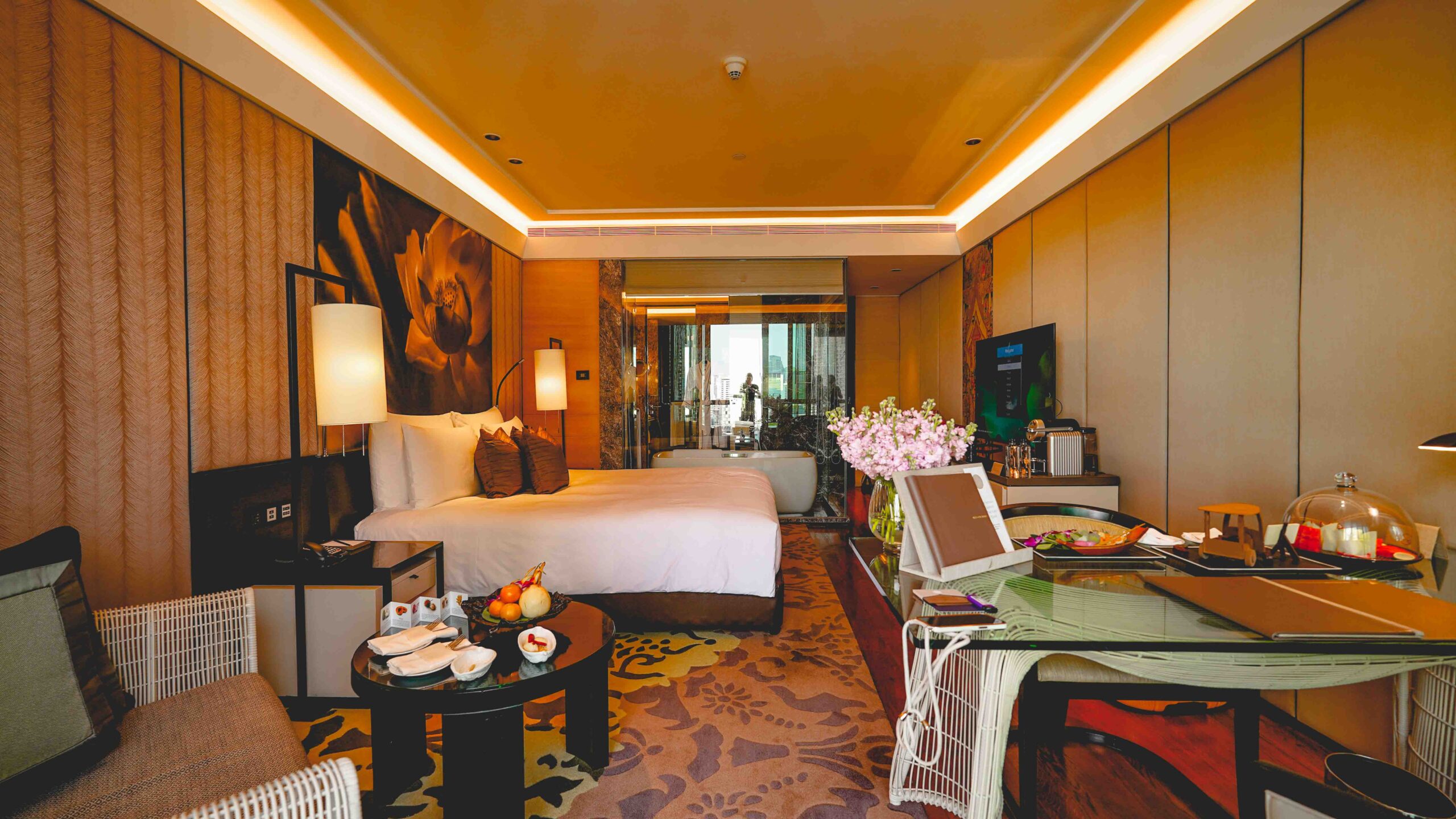 Die 401 luxuriösen und großzügig geschnittenen Zimmer und Suiten verteilen sich auf zwei Flügel, den Garden Wing und Royal Wing. Alle Zimmer bieten einen schönen Blick auf den innen liegenden Garten und sind im modern-luxuriösen Thai-Stil gestaltet. Zur Ausstattung gehören unter anderem: Klimaanlage, Safe, Minibar, Tee- und Kaffeekocher, LED TV mit wireless Tastatur für kostenlosen Internetzugang, Telefon, Schreibtisch, Sitzecke und teilweise Balkon. Das Badezimmer ist durch eine Glaswand abgetrennt und verfügt über Föhn, Badewanne, Dusche sowie Bademantel.Die Farbpalette der Lobby spiegelt sich auch in den Zimmer wieder. Die Farben sind aufeinander abgestimmt und verleihen eine warme und edle Stimmung im Zimmer. Die komplette Beleuchtung lässt sich mühelos über ein Panel an der Wand steuern, ebenfalls die Gardinen und Vorhänge.