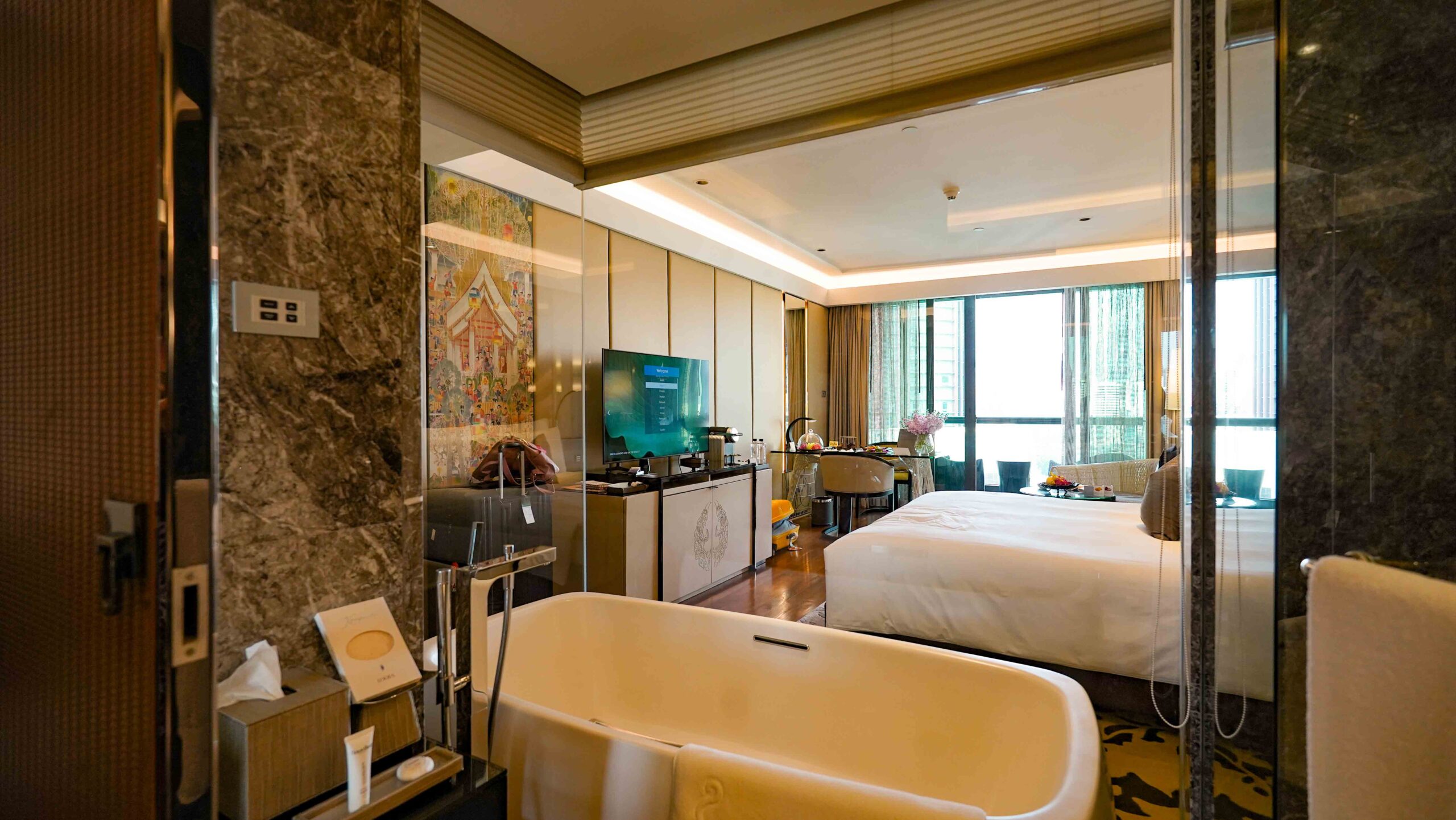 Vom Balkon hat man einen atemberaubenden Ausblick auf die Poollandschaft und die Skyline von Bangkok. Der Balkon ist mit zwei gemütlichen Korb-Sitzstühlen und einem Tisch ausgestattet und dank der Größe lässt es sich auch hier gemütlich sitzen. Die alkoholfreien Getränke und einheimischen Biere aus der Minibar gibt es zudem inklusive.