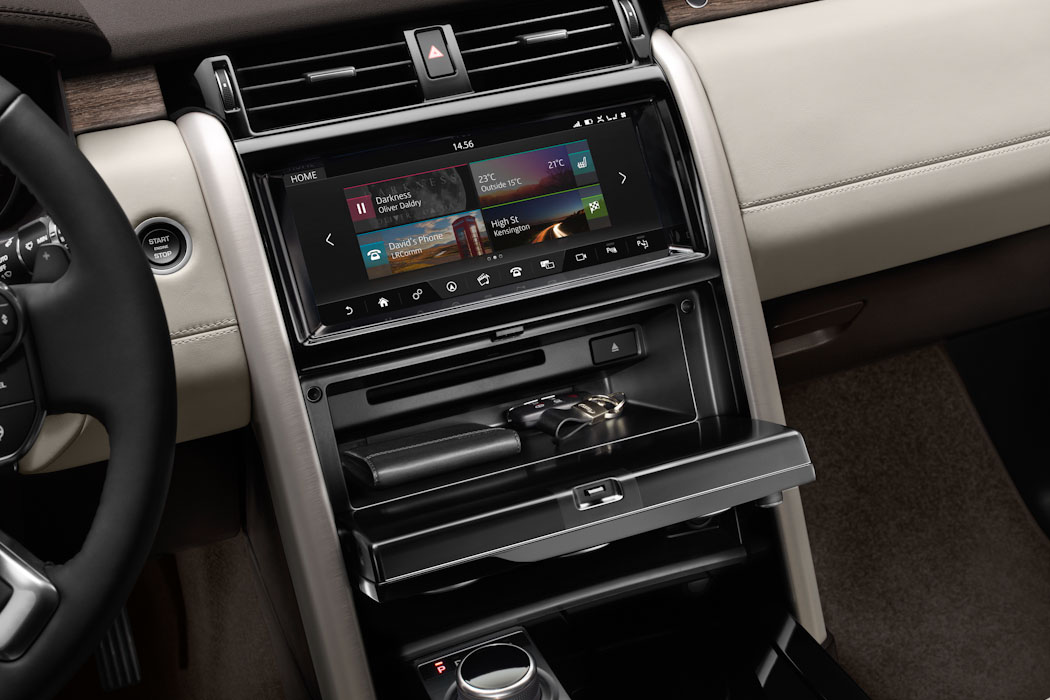 Für moderne und aktive Familien bietet der Discovery auch genügend Stauraum und Ablageflächen für alle modernen Geräte, ohne dass man anschliessend lange suchen muss. Das Ablagefach in der Mittelkonsole ist groß genug für vier Ipads oder ein paar Zwei-Liter-Flaschen – ebenso wie ein Staufach in der Mittelarmlehne für bis zu fünf Ipads oder auch ein „Geheimfach“ für kleinere Gegenstände hinter dem klappbaren Medienpanel der Klimaanlage. Mit dem Design und der neusten Technik kann der neue Discovery definitiv überzeugen.
