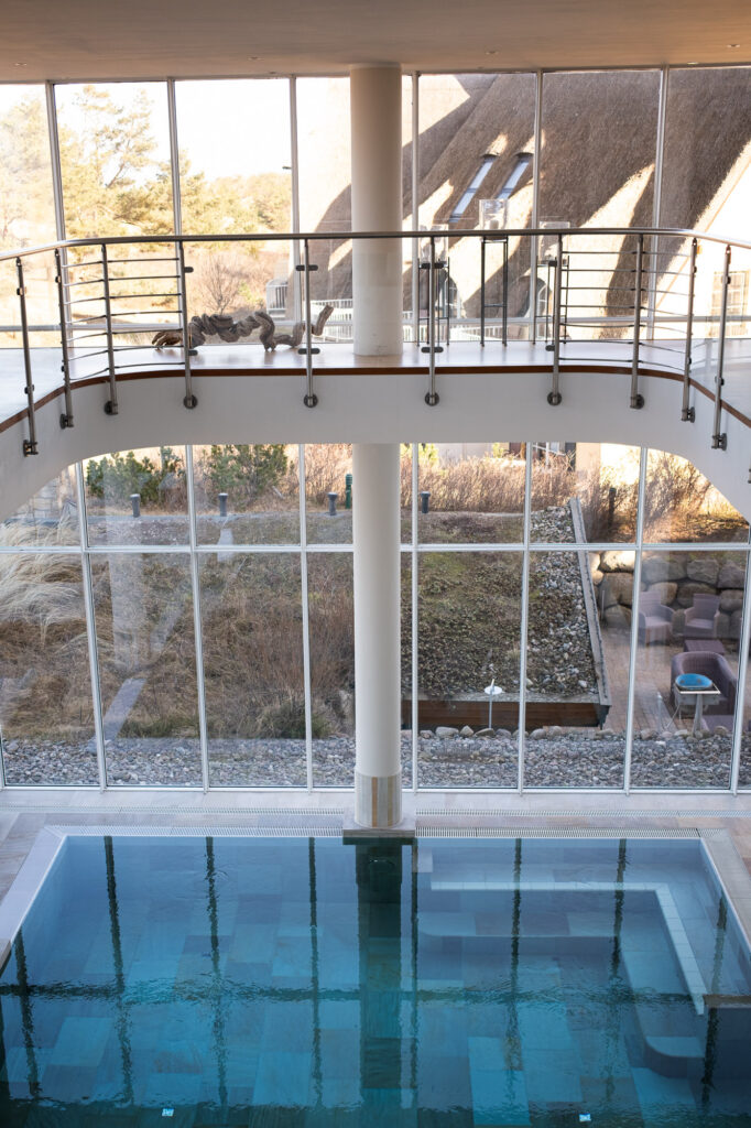 Der Spa Bereich ist großzügig, aber nicht kühl. Er wirkt offen, ruhig und angenehm zurückgenommen. Es gibt mehrere Saunen, Ruhezonen und Anwendungen, aber besonders in Erinnerung geblieben ist uns der offene Poolbereich. Er erstreckt sich über zwei Etagen und gibt den Blick Richtung Ostsee sowie Dünen frei. Schon allein diese Offenheit verändert die ganze Wirkung des Raumes. Man schwimmt nicht in einem abgeschlossenen Innenbereich, sondern hat immer das Gefühl, dass draußen das Meer präsent bleibt.