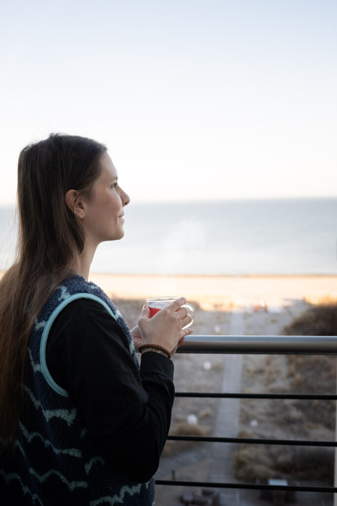 Unsere Tage bestanden aus langen Spaziergängen am Strand, aus Zeit im Spa, aus Lesen, aus Kuchen, aus Frühstück mit Meerblick und aus dem angenehmen Gefühl, dass der Tag nicht von außen bestimmt wird. Anfang März ist der Strand in Dierhagen fast leer. Wir konnten kilometerweit laufen, ohne ständig anderen Menschen ausweichen zu müssen. Man hört vor allem den Wind, die Wellen und manchmal Möwen.
