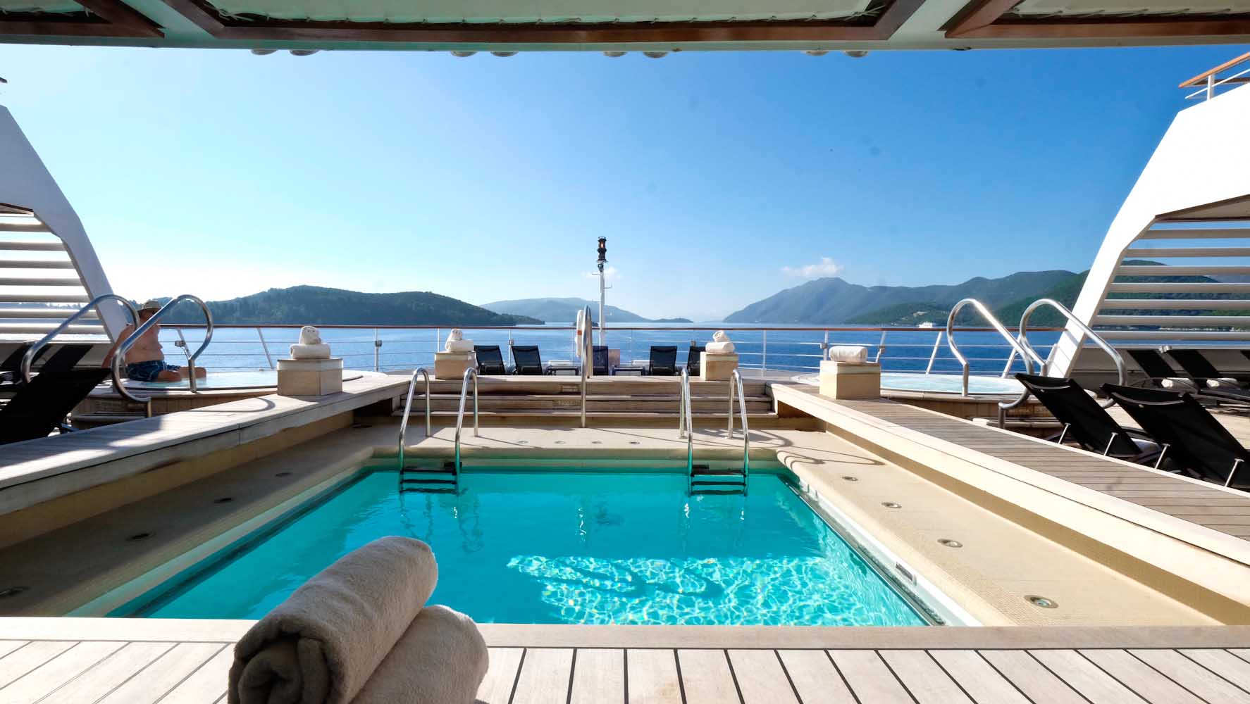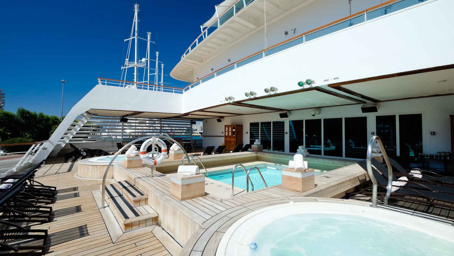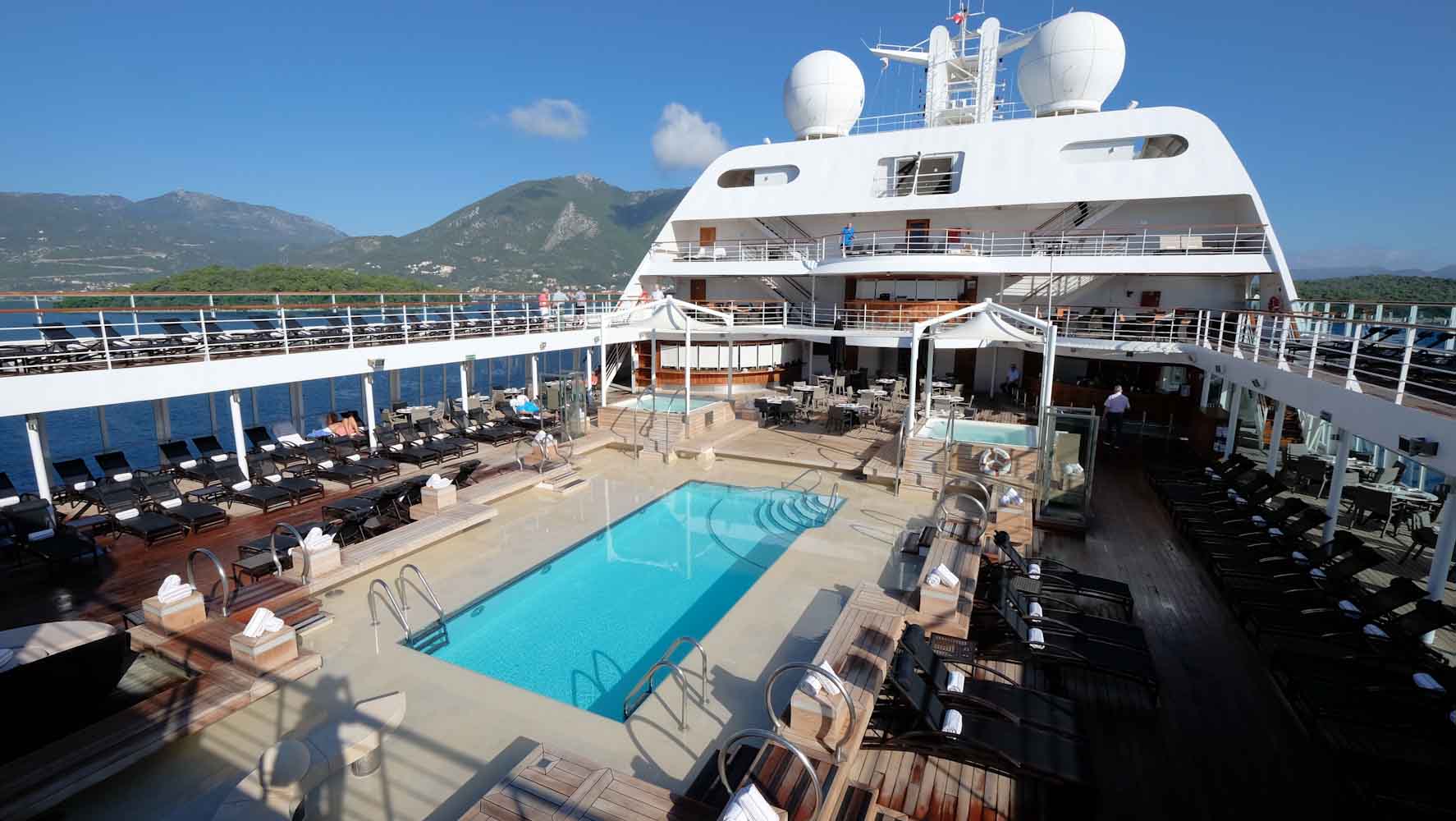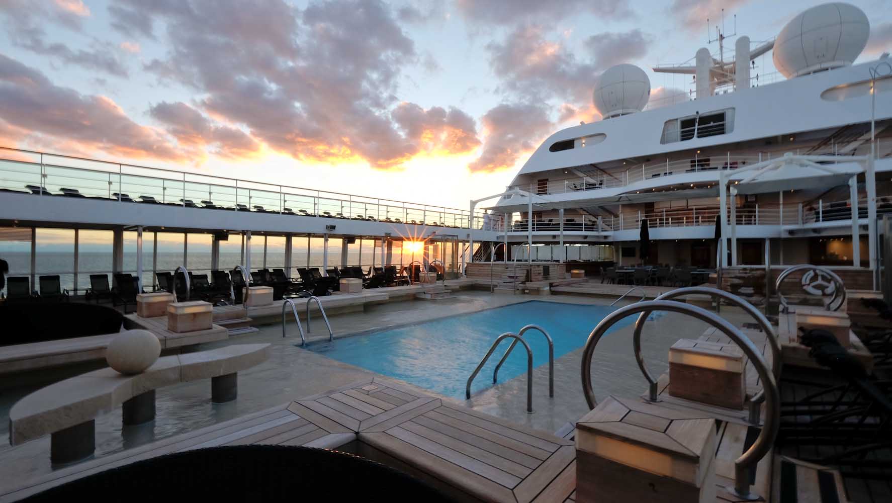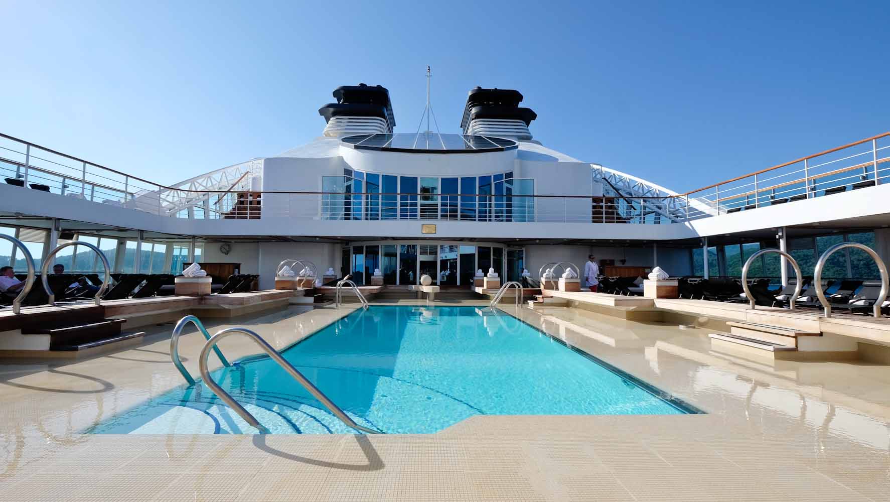 Die verschiedenen Decks könnt ihr entweder über die Treppe erreichen oder auch mittels der Fahrstühle an Board. Meine Suite befindet sich an Deck 7 und so geht es in wenigen Schritten zum Hauptdeck 8 & 9. Hier befindet sich der große Hauptpool mit zwei Whirpools, einer Bar und einer fantastischen Aussicht über das ganze Schiff. Es stehen genügend Liegen und Handtücher um den Pool herum und sobald ihr euren Platz gefunden habt, werdet ihr auch sofort bedient. Ihr könnt hier von kleinen Kaviar Häppchen bis zu einem richtigen Mittagessen alles kostenfrei bestellen. Ich sehe viele Gäste gemütlich in der Sonne mit einem Glas Champagner liegen und kann es immer noch nicht richtig glauben, dass ich auf einem Kreuzfahrtschiff bin.