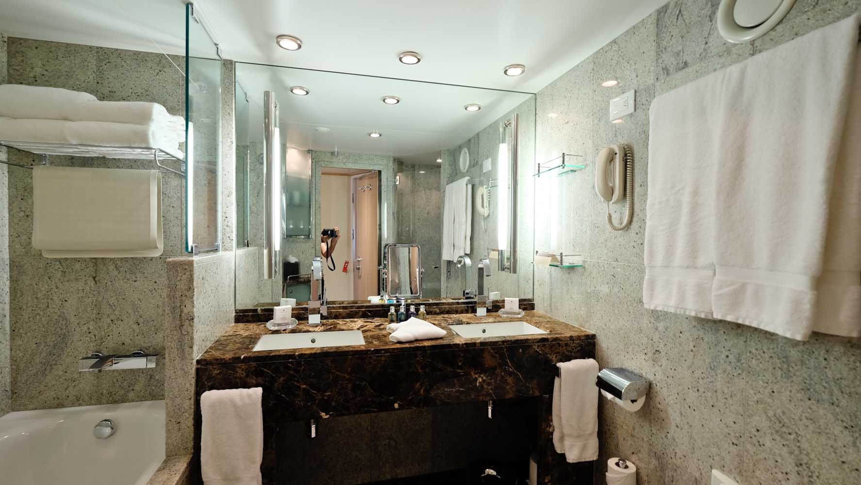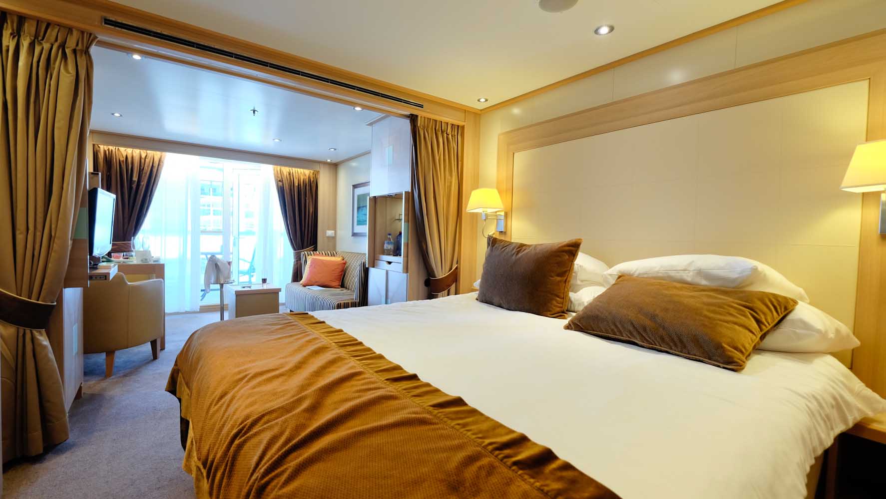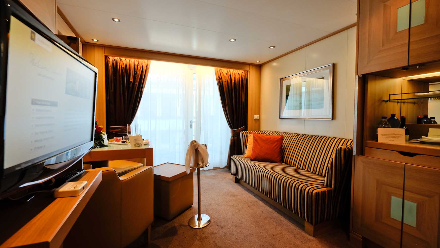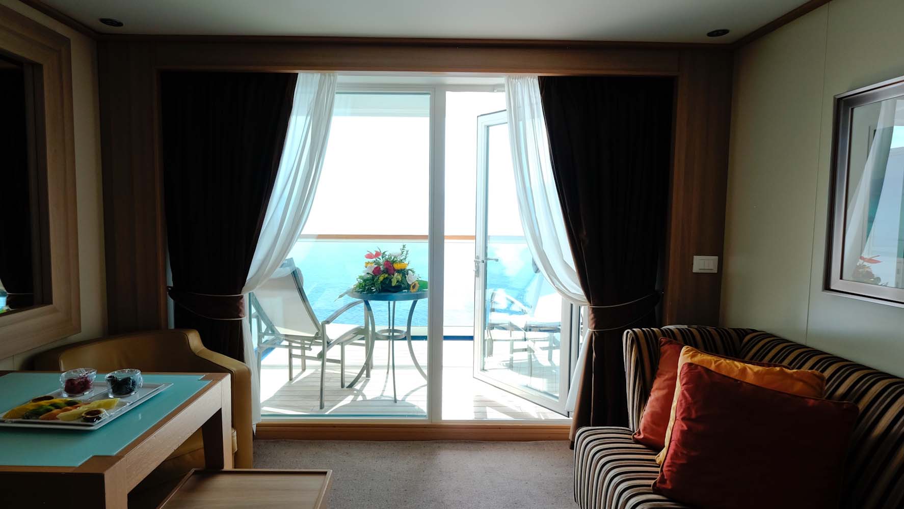 Die Decks sind groß, so dass ich mich beim ersten Mal etwas verlaufen habe , obwohl an jeder Etage ein Deckplan mit allen Informationen ausgehängt ist. Wahrscheinlich war das einfach auch meine Aufregung und Neugier, denn ich konnte nicht schnell genug in meine Kabine eilen. Es gibt insgesamt 229 Suiten an Board und 90% davon haben eine private Veranda. Meine Kabine wirkt nicht nur durch die hellen und warmen Farben sehr geräumig, sonder sie ist es tatsächlich auch. Meine Veranda Suite mit 28qm Innenfläche und 6qm Verandafläche ist fast wie ein kleines Apartment. Die Kabine hat im Badezimmer nicht nur eine Dusche, sondern auch eine Badewanne findet hier Platz und zudem ein begehbarer Kleiderschrank. Bevor ich alles inspizieren kann klingelt es an der Tür und meine persönliche Stewardess begrüßt mich mit einer Obstplatte und Champagner.