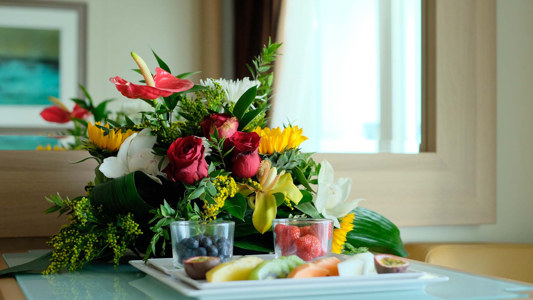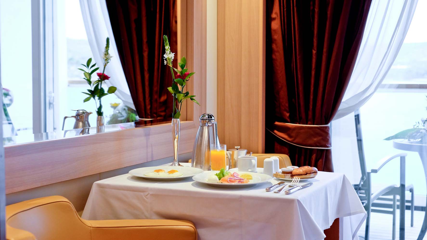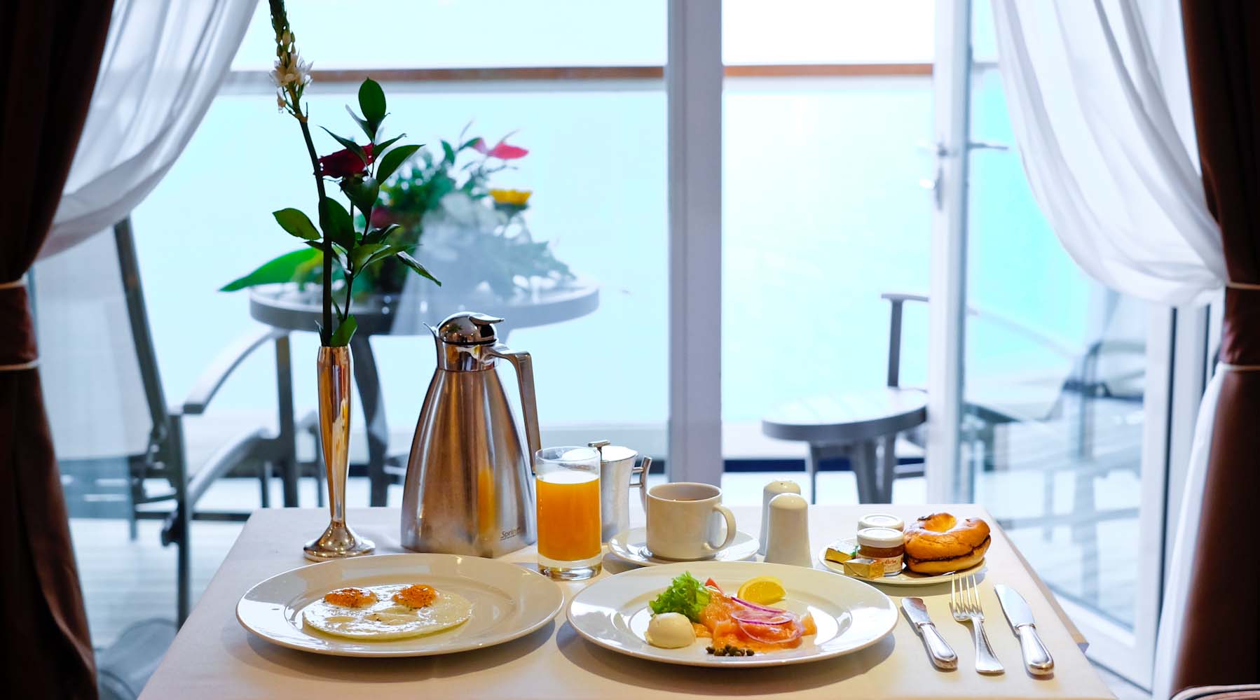 Ich bin kein großer Fan von Room Service, da man oftmals nur eine „abgespeckte“ Variante der Köstlichkeiten serviert bekommt – ausser vielleicht beim Frühstück. Auf der Seabourn ist das definitiv anders. Jedes Gericht und jedes Getränk (welches an Schiff vorhanden ist) kann von dem Gast bestellt werden und wird ohne lange Wartezeiten in der Suite serviert. Jeden Abend liegt im Zimmer bereits die Frühstückskarte bereit, so dass ich fast jeden Morgen alle Köstlichkeiten in meiner Suite oder auf der Veranda geniessen konnte. Jeden Tag stehen frische Blumen und eine köstliche Obstplatte auf meinem Tisch und die Stewardess fragt stets freundlich nach, ob ich noch etwas benötige.