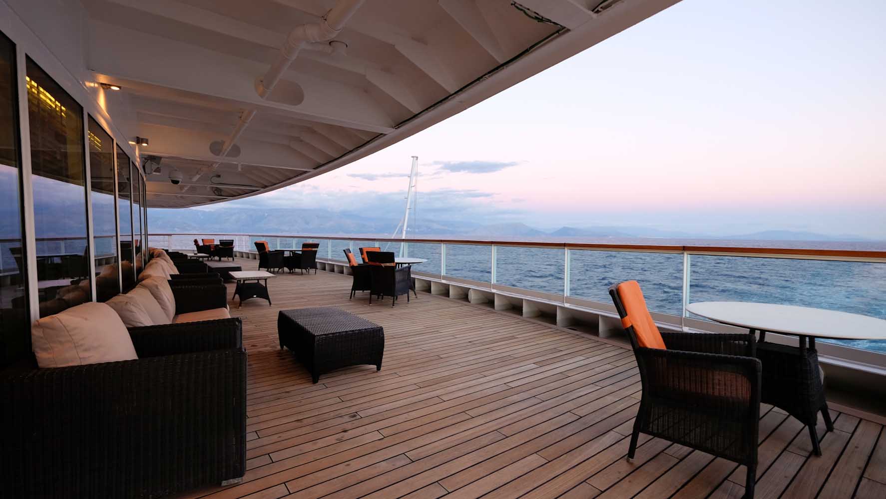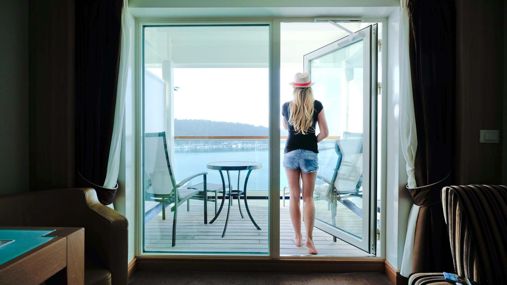 Zu meiner Kabine gehören nicht nur die feinsten Seifen von L’Occitane oder Badeprodukte von Molton Brown, sondern auch ein privater 24 Stunden Service. Ich darf mir zu der bestehenden Minibar noch zwei weitere Alkoholische Getränke meiner Wahl für die Reise kostenfrei bestellten. Die Auswahl ist groß und selbst Getränke, die nicht auf der Karte stehen, werden nach Möglichkeit organisiert. Ich bin einfach nur überwältig und bestaune mit einem Glas Champagner erstmal die Veranda.