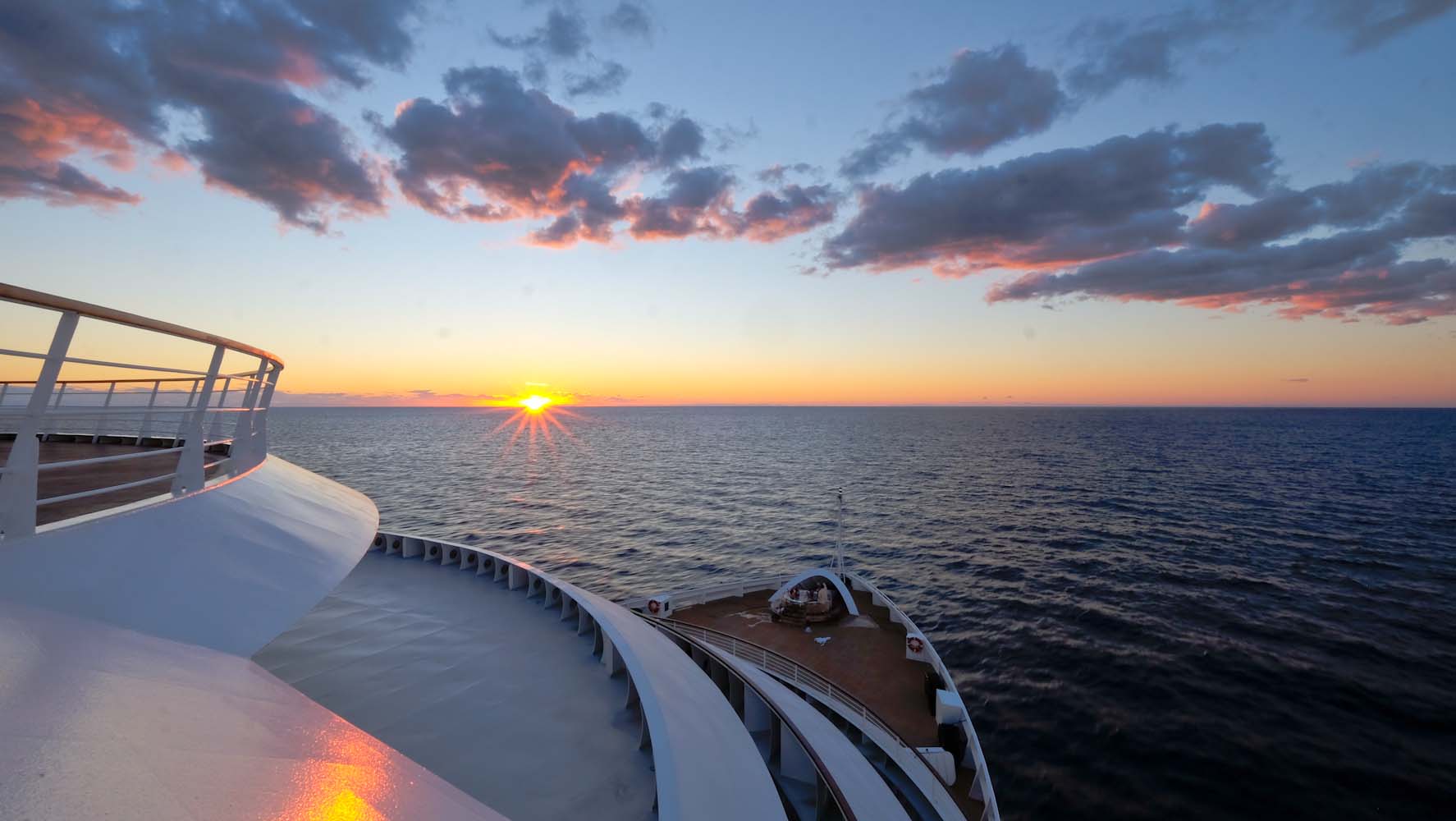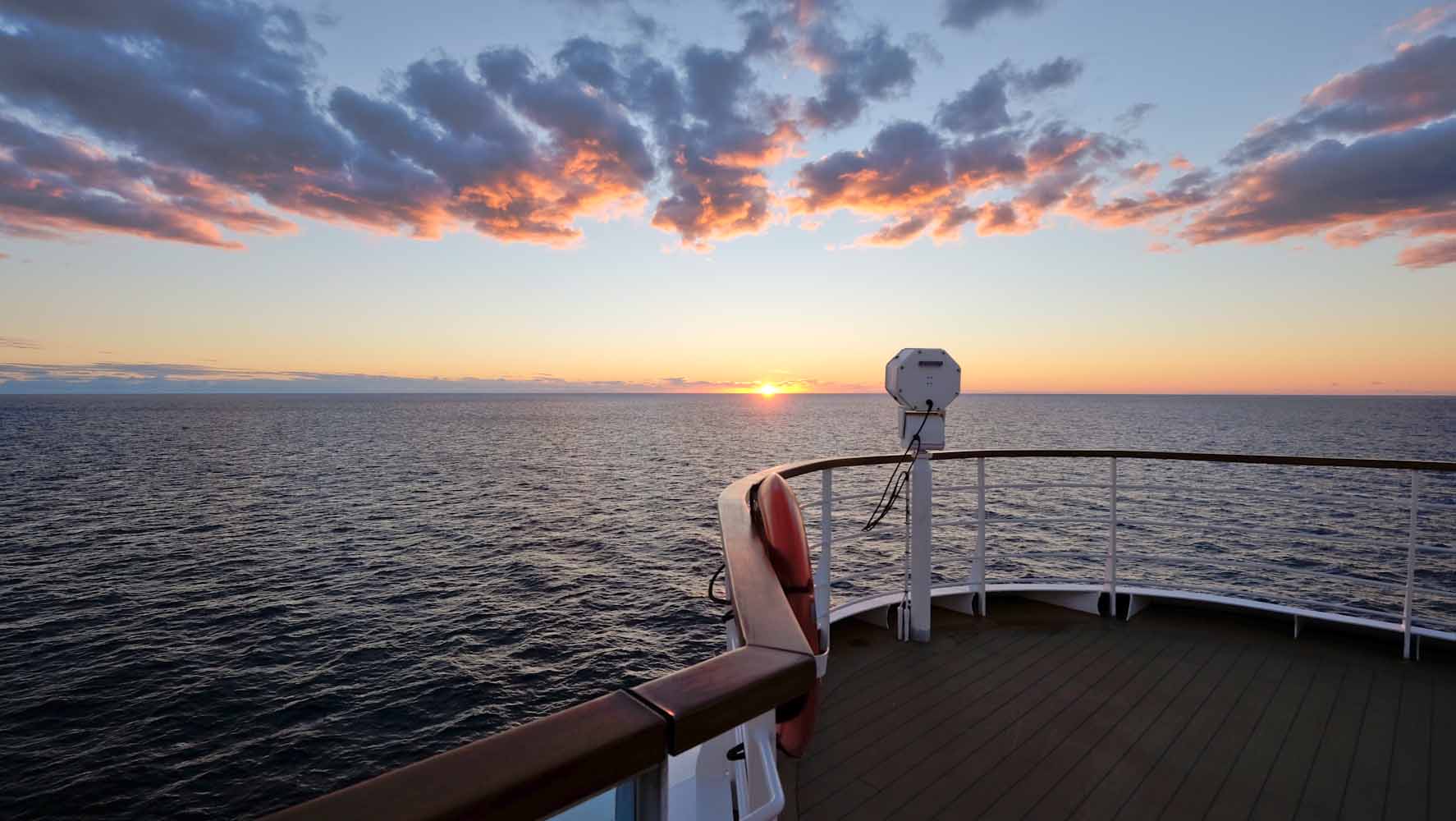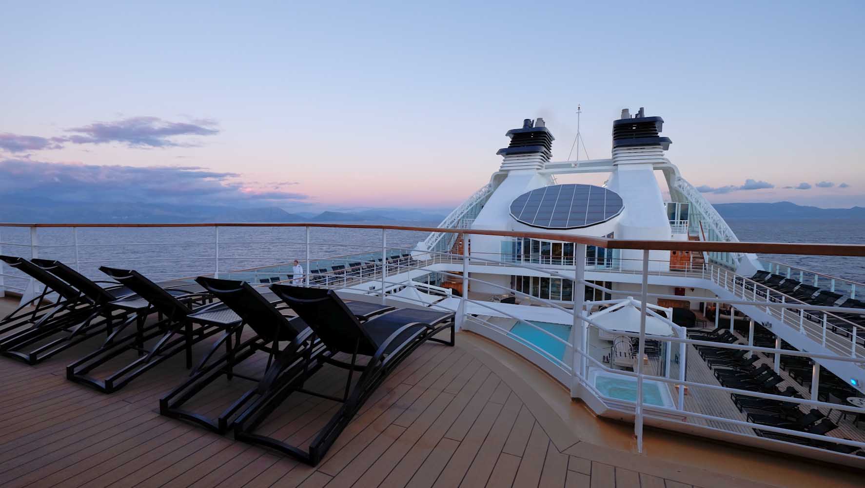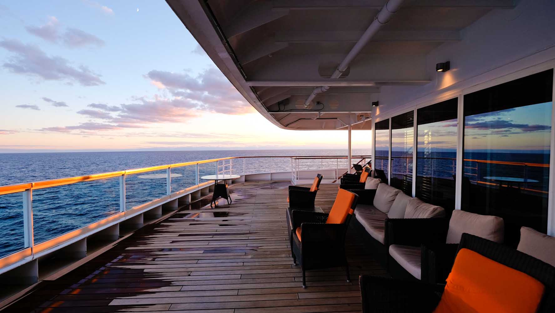 Jedes Deck hat etwas besonderes an sich und doch haben sie alle etwas gemeinsam: eine atemberaubende Aussicht und jede Menge Platz zum Entspannen! Es ist gelegentlich schwer sich zu entscheiden, wo man beim Ablegen die Aussicht geniessen sollte, oder wenn die Sonne untergeht und nichts als das Weite des Meeres zu sehen ist. In den ersten Tagen bin ich tatsächlich alle 10 Minuten von einem Deck zum anderen gelaufen. Es war diese Euphorie die mich jede Sekunde an Board begleitete – Tag und Nacht! Nach etwa 3 Tagen hatte ich mich etwas beruhigt und Deck 10 mit der Aussicht von der „Observation Bar“ wurde zu meinem festen Platz. Von hier aus beobachtete ich fasziniert, wenn das Schiff ablegte und sich langsam in Richtung Meer bewegte, oder wenn die Sonne am Horizont unterging und ich mich schon etwas wie auf der Titanic (nur sicher) fühlte. Das Gefühl ich wäre auf der Titanic kam tatsächlich häufiger vor, denn alles war so imposant und luxuriös.