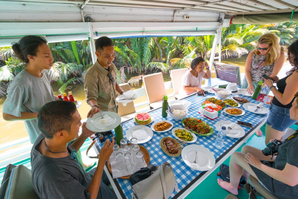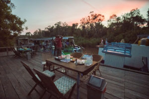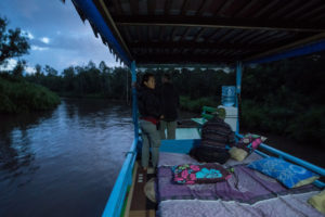 Nach dem ersten Stop am Nachmittag beginnt es auch schon zu dämmern, nachdem man das Boot wieder erreicht hat. Die Guides und das Küchenpersonal bereiten wenn möglich ein gemütliches Dinner am Landesteg der Haltestation vor. Da der Kapitän die Anlegestelle freihalten muss, fährt man anschließend noch etwas weiter um entlang des Flusses den „Anker“ auszuwerfen. In der Dämmerung kann man nocheinmal die verschiedenen Affenarten am Flussufer bei ihrem Abendessen beobachten. Die Klotoks haben auf dem oberen Deck Matrazen für die Nacht und Moskitonetze gegen unerwünschte Besucher.
