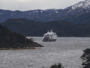 Die Nacht über fuhr das Schiff sanft durch die Kanäle Feuerlands, um im Morgengrauen durch die Almirantazgo-Sund zur Ainsworth-Bucht zu gelangen. An der Ainsworth-Bucht angekommen, Rettungsweste angezogen, zu den Booten gebeten, auf die Boote gesetzt und mit einem holprigen Auf und Ab zum Strand gefahren. Hier wurden die Rettungswesten abgelegt und unsere Wanderung durch den subantarktischen, magellanschen Urwald begann, bei der wir nahezu die ganze Zeit den Marinelli Gletscher im Blickfeld hatten, bis zu einem Bieberdamm.