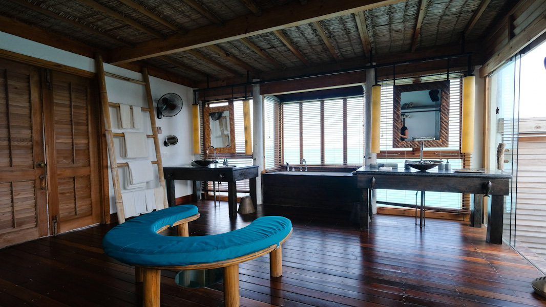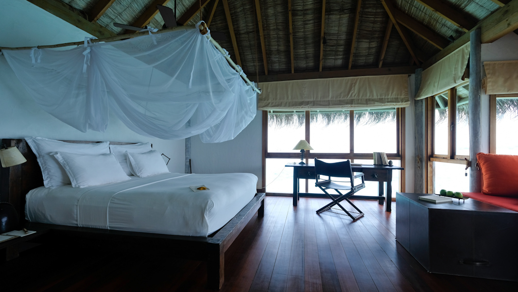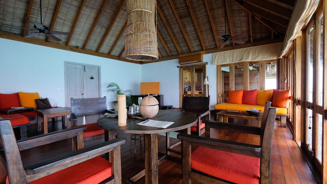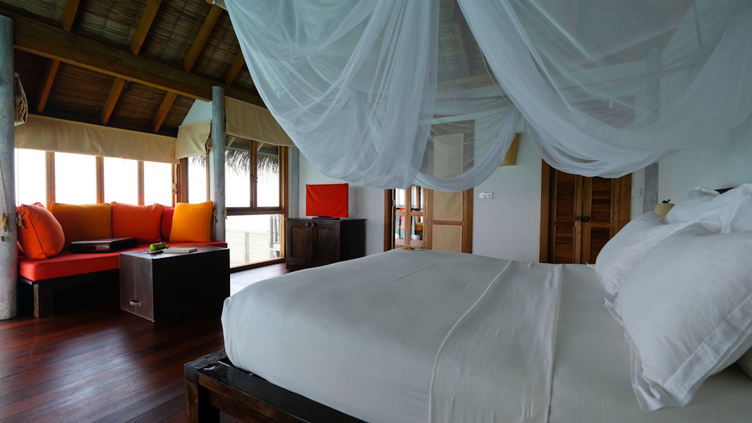 Die insgesamt 45 Villen sind alle in der Lagune über dem Meer erbaut und können über einen Steg oder per Boot von der Insel erreicht werden. Sie bestechen durch eine kreative, natürliche Erscheinung im Robinson Crusoe Stil in naturverbundener Bauweise und Eleganz. Einzig die Crusoe Residences liegen freistehend in der Lagune und sind nur per Boot erreichbar. Der Abstand zwischen den einzelnen Villen beträgt zwischen 15 und 25 m. Die umweltfreundlichen Unterkünfte verfügen jeweils über ein privates Sonnendeck und einen Wassergarten sowie Kabel-/Sat-TV, einen DVD-Player und ein BOSE Surround-Sound-System. Beeindruckend ist die Größe der Villen (ab 210qm ) denn auf zwei Etagen geniesst man hier den Komfort und Ruhe. Wer gerne mal unter freiem Himmel schlafen möchte, dem steht ein teilüberdachtes Bett zur Verfügung, welches auf Wunsch in eine romantische Schlafoase verwandelt wird. Alle Villa Suiten stehen auf Stelzen und verfügen über einen sehr großen Außenbereich mit direktem Zugang ins Wasser, ein offenes Wohnzimmer mit Sitzecke, Esstisch mit Blick auf das Meer, zwei Tagesbetten über dem Meer erbaut sowie extra Liegen zum Sonnenbaden. Das Badezimmer ist ebenfalls sehr großzügig und offen gehalten mit einem extra abgetrennten Duschbereich. Zu jeder Villa gehört der Service der „Mr. Friday (Butler), die sich um jegliche Belange und Anfragen der Gäste kümmert. Für einen kleinen Spassfaktor sorgen die Bamboo Fahrräder und die eigene Schnorchelausrüstung.