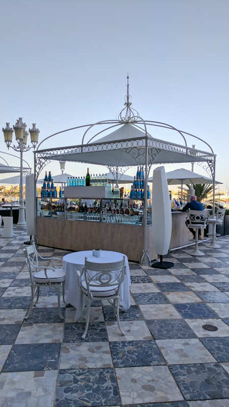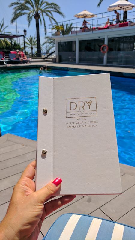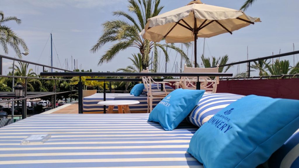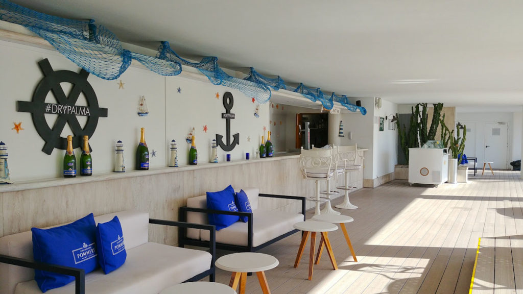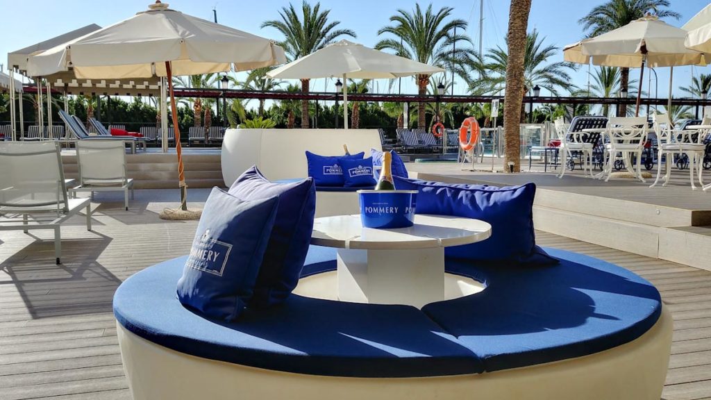 Wenige Schritte von der Lobby erreicht man den Pool und die Dry Bar. Den Gästen stehen zahlreiche gut gepolsterte Liegen zur verfügung und auf einer kleinen Plattform gegen Gebühr auch Tagesbetten mit Service und etwas mehr Privatsphäre. Der Bereich wirkt sehr gepflegt und das Augenmerk liegt hier auch auf der Champagnermarke „Pommery“, die sich in zahlreichen Details wiederfindet.