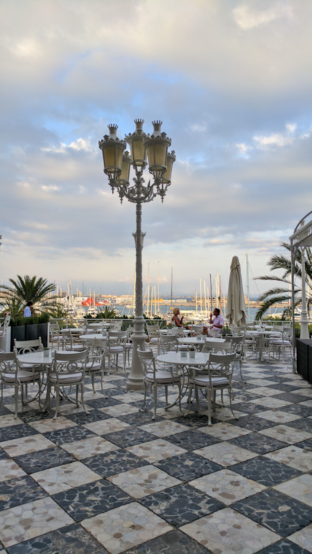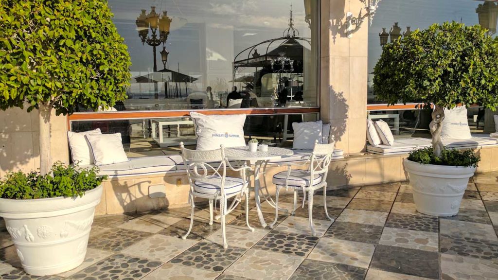 Der Übergang von der Lobby zum Restaurant und der Terrasse, die einen perfekten Blick auf den Pool, die Kathedrale und die Promenade bietet, präsentiert sich hell und anmutig edel. Das Foyer erinnert ,durch die mit Samt gepolsterten Barock ähnlichen Sessel, an eine große Empfangshalle in einem Schloß. Diese Elemente finden sich auf der Terrasse in hellen Tönen wieder und laden an der Bar zu gemütlichen Stunden ein.