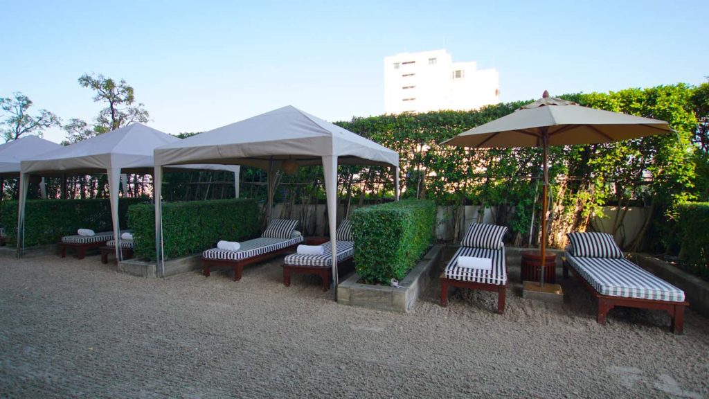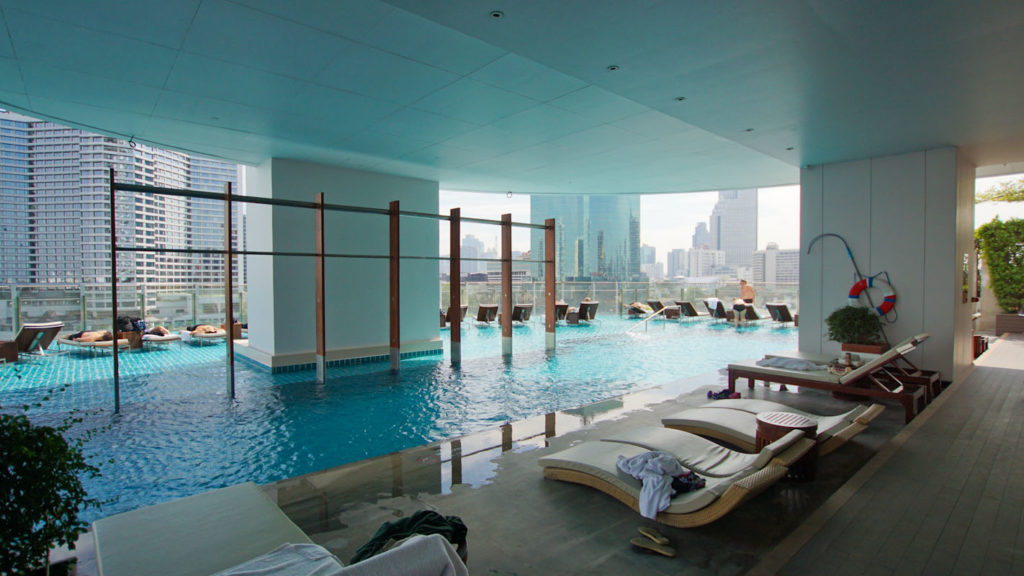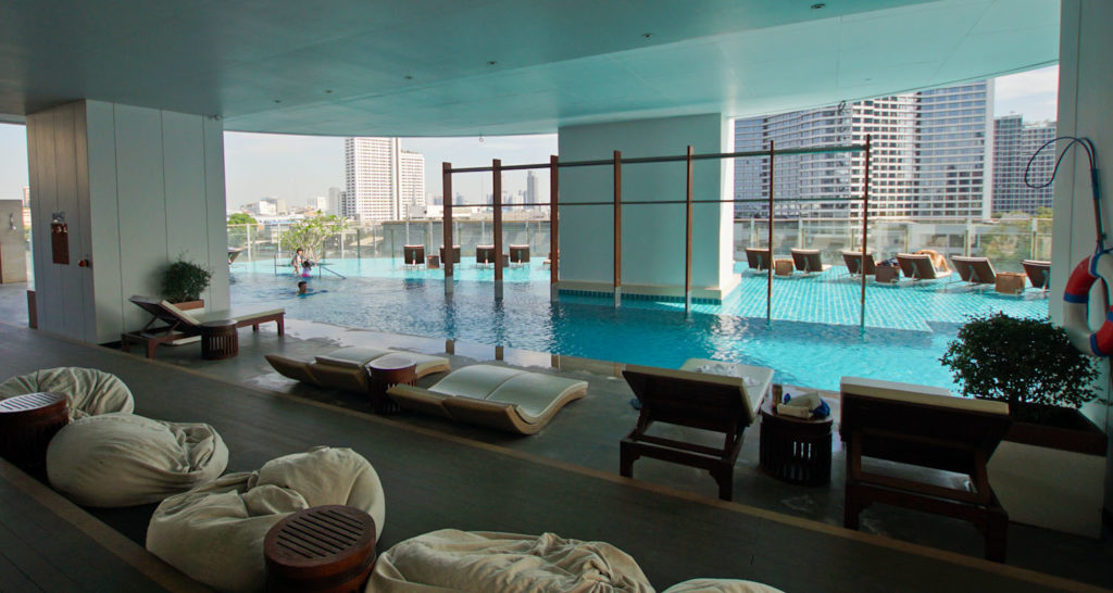 Ich habe insgesamt vier Tage in Bangkok verbracht und war daher über den Pool und die gemütlichen Erholungsmöglichkeiten im Hotel sehr dankbar. In der vierten Etage befindet sich der Pool mit einem Ruhebereich und drei Whirlpoolecken, sowie Tagesbetten. Die Liegen stehen im Wasser, so dass der Weg dorthin durch den Pool führt. Seitlich am Pool findet ihr drei kleinere private Whirlpools mit zwei Sonnenmatratzen und auf der anderen Seite weitere Tagesbetten zum Entspannen. Vom Pool geniesst man den Ausblick auf den Fluss und das Treiben.