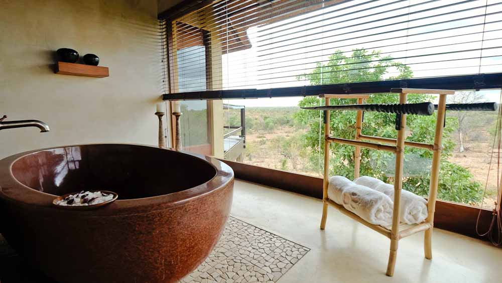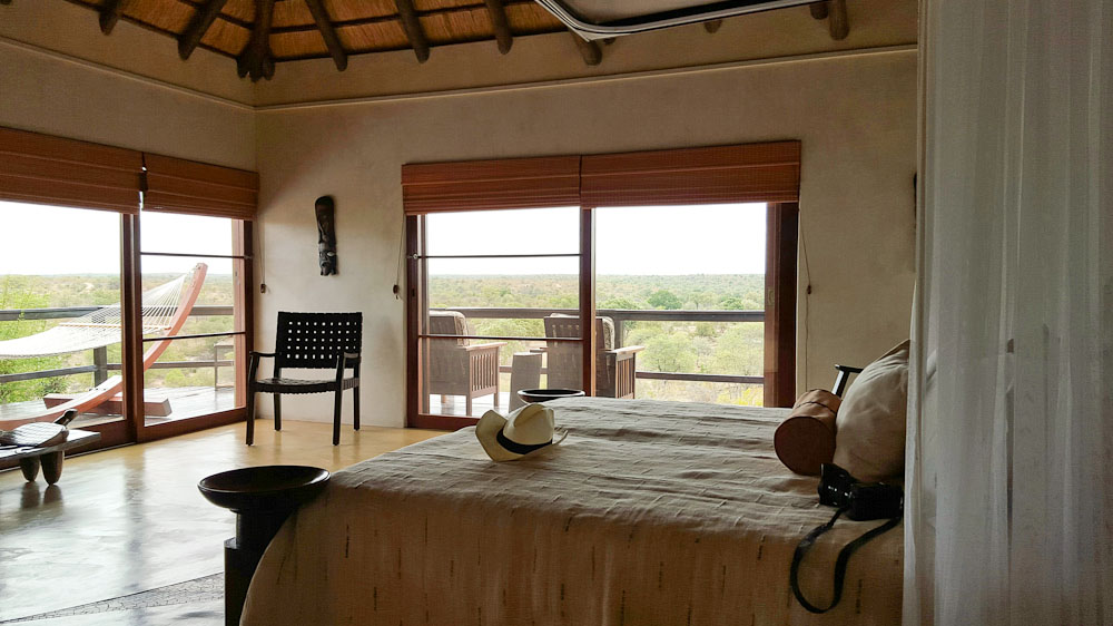 On the way to the lodge you can already enjoy the park and look forward to the coming days . The Lodge is situated higher on a hillside from which you have a very good view of the reserve . The first impression upon arrival makes me really speechless when I enter my room , or rather enter my house .