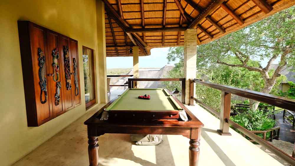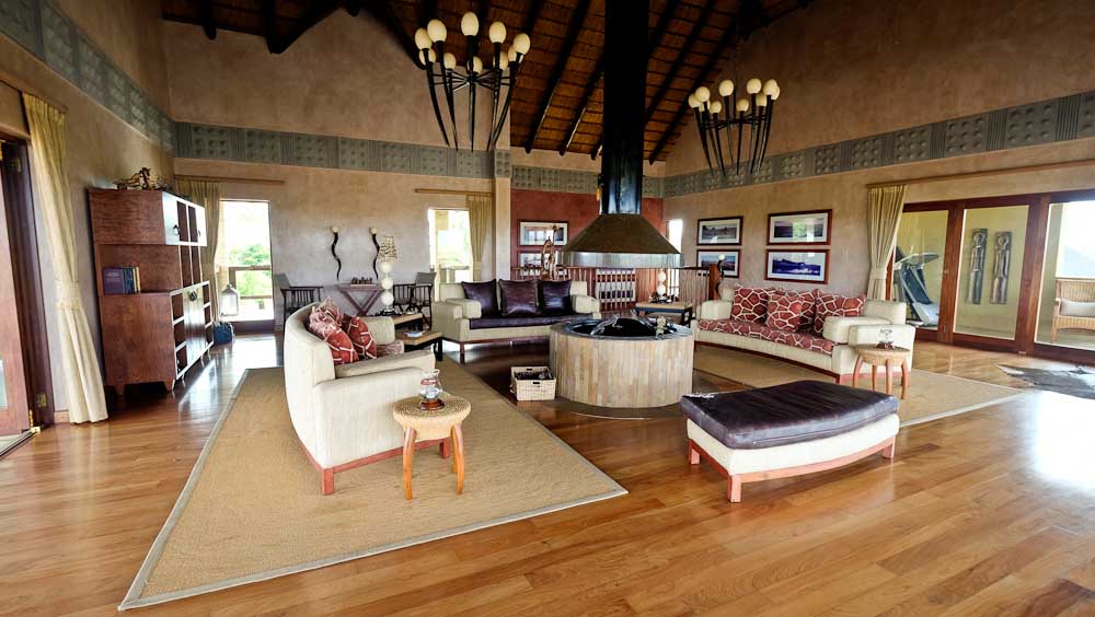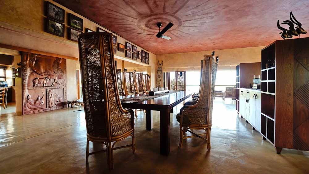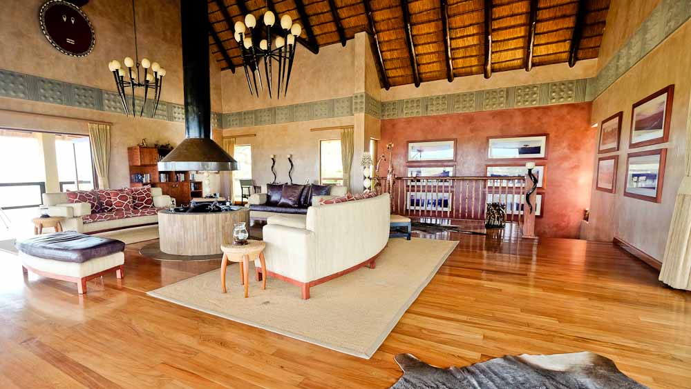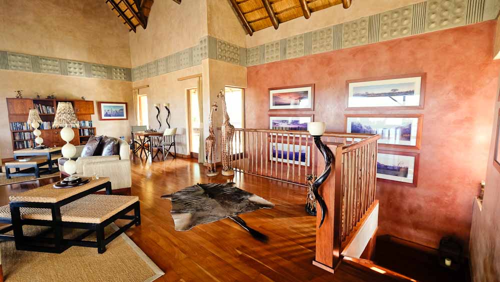 Das Haupthaus gliedert sich in zwei Etagen auf und einen hinteren Bereich zum abendlichen Grillen. In der ersten Etage gibt es einen großen Raum mit gemütlichen Sitzsofas und einem großen Esstisch, der sich in der Nähe der Küche befindet. Alles ist wunderschön und stillvoll in einem Safari Look eingerichtet und viele Details wie Bilder, Figuren und Tischdecken harmonieren perfekt mit der Einrichtung. In der ersten Etage gibt es auch zwei Terrassen, die zur jeder Seite einen wunderschönen Ausblick auf das Reservat oder den Naturpool bieten.