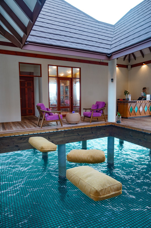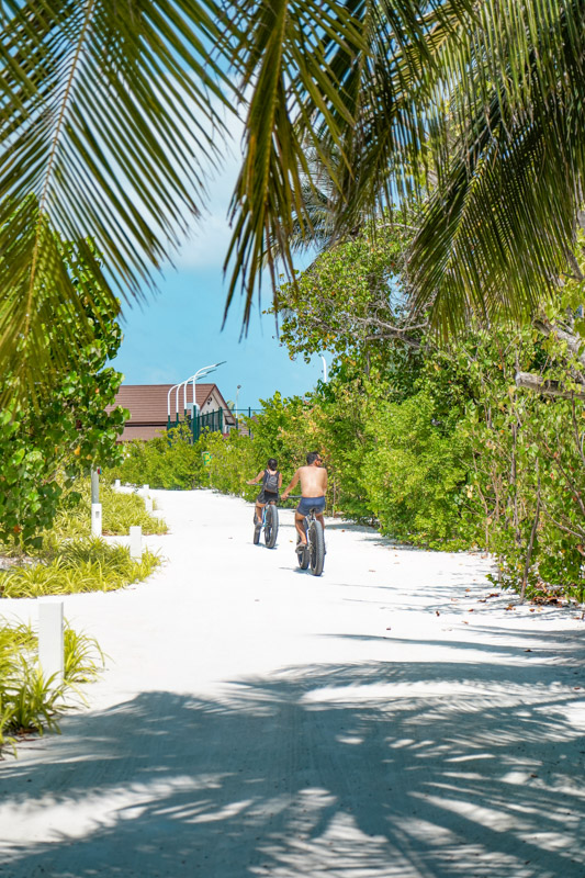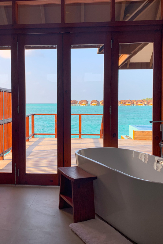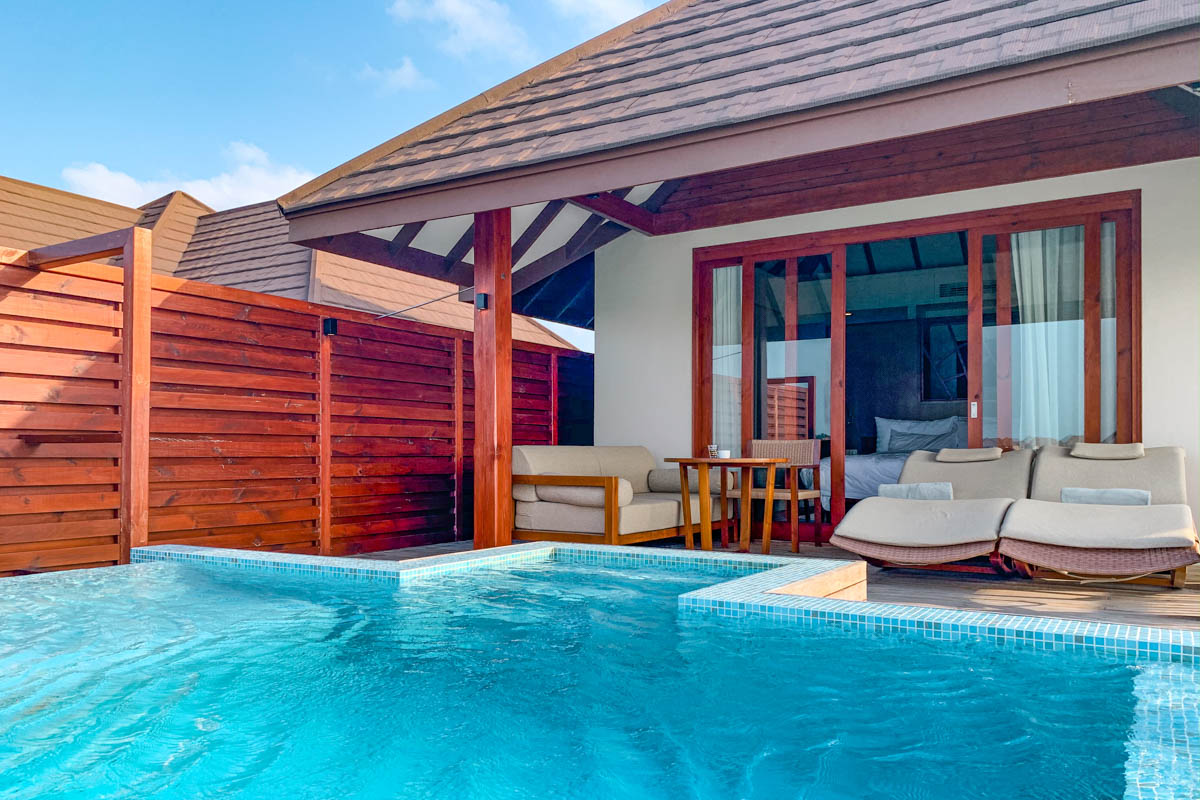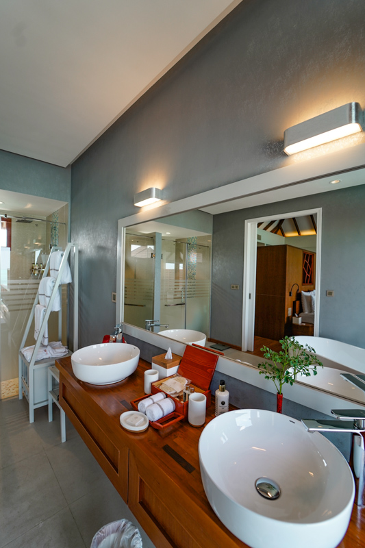 Die 69 Overwater Villas verfügen über ein typisch maledivisches Interieur und einen direkten Zugang zur türkisfarbenen Lagune von der Terrasse. Alle Villen und Suiten sind mit natürlichen Materialien aus Holz und Stein verarbeitet und bieten einen minimalistischen Stil in Kombination mit buten Farbakzenten. Die Inneneinrichtung spiegelt die Tradition und Kultur der Malediven wieder. Die Wege im Resort sind überschaubar, jedoch stehen an der Rezeption Fahrräder zur freien Nutzung bereit oder man lässt sich einen Buggy kommen.
