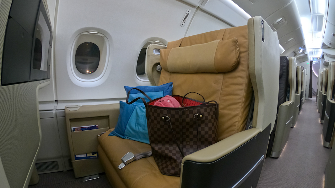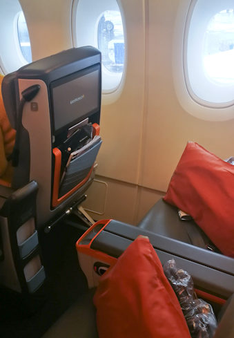 Der Sitz ist außerdem mit einem 39 cm breiten LCD Bildschirm inklusive USB- und Stromanschluss, exklusiv designter Bettwäsche und Tafelgeschirr sowie einem breiten, höhenverstellbaren Tisch ausgestattet. Unter dem Sitz gibt es großzügigen Stauraum für das Handgepäck. Links vom Monitor befindet sich ein kleiner Tisch zum ausklappen für Getränke. Darüber befindet sich zusätzlich noch ein kleiner Schminkspiegel. Alle Sitze sind mit einem hell- oder dunkelbraunen Leder bezogen und von einer beigen Verschalung umgeben.