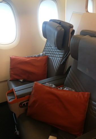 Die Sitze in der Business Class sind in Flugrichtung nebeneinander in einer 1-2-1 Konfiguration angeordnet, so dass sich allen Fluggästen direkter Zugang zum Gang bietet. Auf Wunsch sorgt ein seitlicher Sichtschutz für noch mehr Privatsphäre.