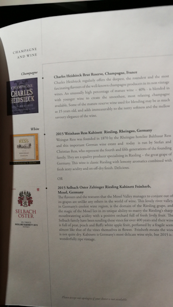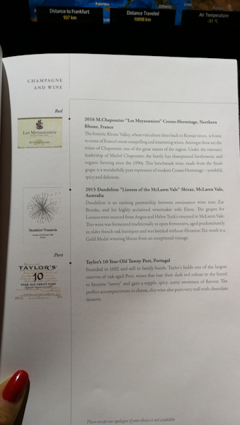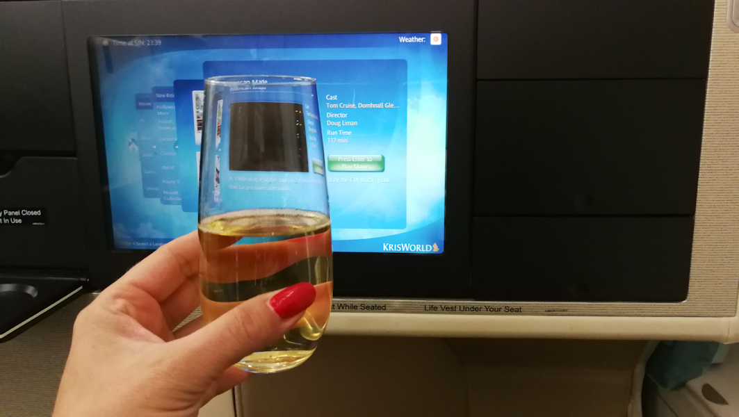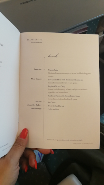 Kurz nach dem Boarding werden Welcome Drinks angeboten. Ich habe mir ein Glas Champagner bestellt. Am Platz warteten große Kissen, Socken, Slipper und das Amenity Kit. Auch die Noice Cancelling Kopfhörer gehören hier zur Ausstattung. Singapore Airlines bietet auf ausgewählten Business Class Flügen den “Book the Cook” Service an, dh. bis zu 24 Stunden vor Abflug kann man ein Hauptgericht online vorbestellen. Ich habe hier das reguläre Menü gehabt (Ohne Vorbestellung) und war mit der Auswahl sehr zufrieden. Erwähnenswert ist auch die Auswahl an Weinen und Champagner.
