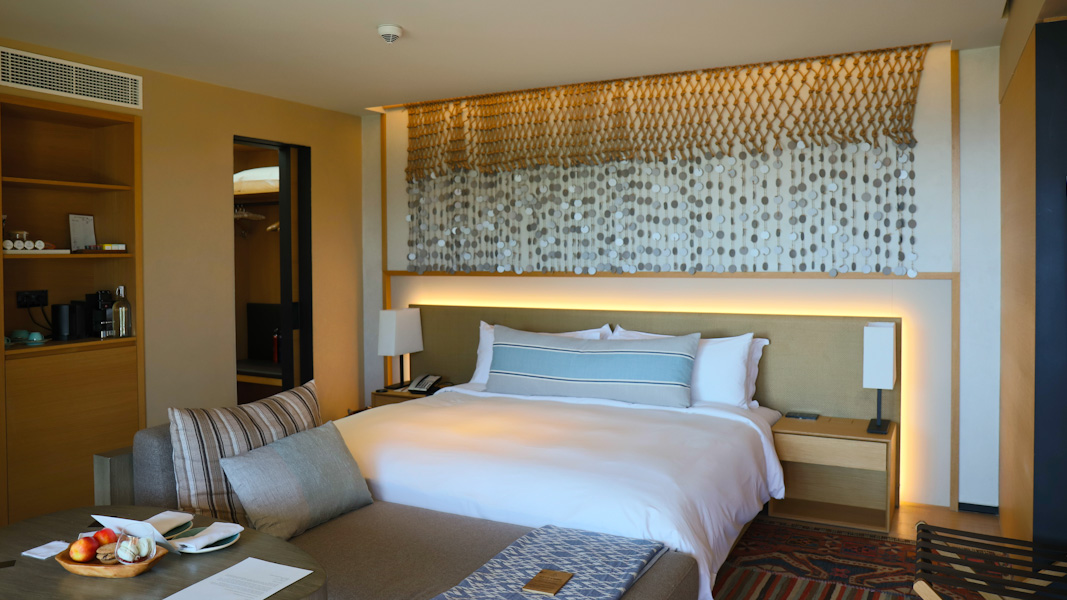 Das harmonische Design mit traditionellen Akzenten setzt sich in den Gästezimmern fort. Eyecatcher an der Wand hinter dem Bett ist eine Kollage aus gewebtem Leder und Teppich. Farbschattierungen aus warmem Gelb, Ocker und tiefen Türkis sorgen für einen erholsamen Schlaf. Die beiden Lampen können auf den Tagesrhythmus abgestimmt werden. Ordnung schafft der begehbare Kleiderschrank. Dezent platziert wurde eine Durchreiche zum Flur – so kann der Roomservice diskret agieren. Wer arbeiten möchte, findet eine bequeme Schreibtischnische. Blickfang ist hier das Originalgemälde eines türkischen Künstlers. Auch gibt es eine Kaffeemaschine und eine Minibar. Technisch sind die Unterkünfte bestens ausgestattet – per iPad lassen sich Klimaanlage und Beleuchtung individuell regulieren. Marshall Bluetooth Lautsprecher sorgen für perfekten Sound.