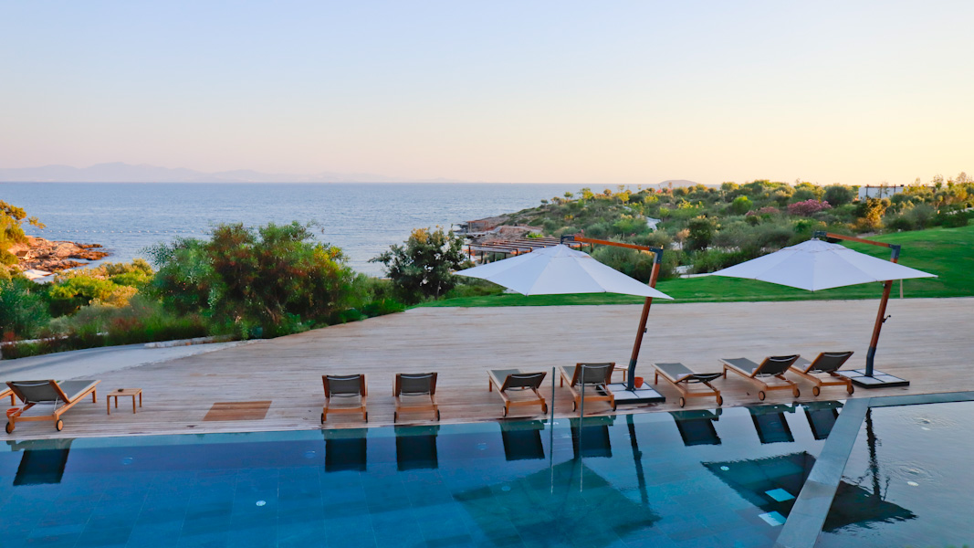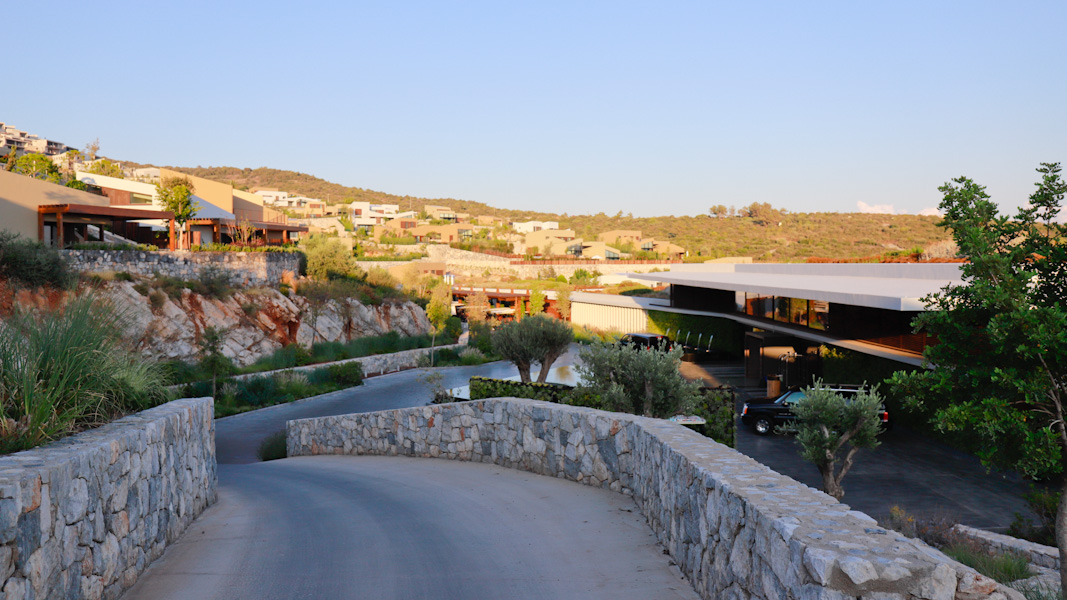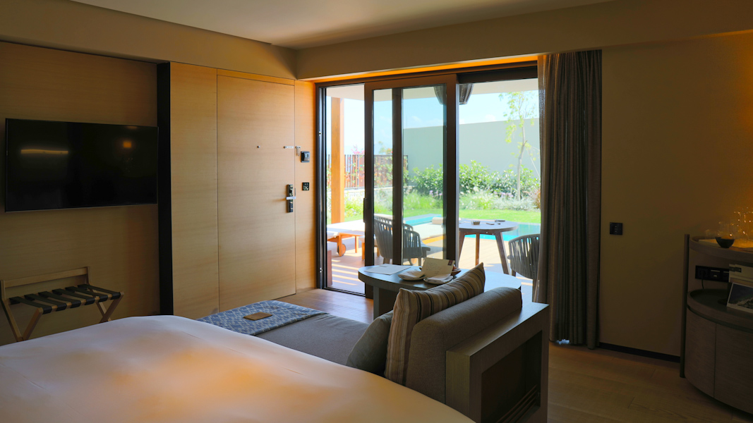 Insgesamt gibt es 141 Gästezimmer inklusive sechs Suiten. 75 Unterkünfte befinden sich im Hauptgebäude; 66 Villen streuen sich in die Anlage. Alle präsentieren einen fantastischen Blick über die Ägäis. Raffiniert greift das Design die natürliche Umgebung auf. Für eine zeitgenössisch schlichte Eleganz wurden erneuerbare und naturbelassene Materialien der Region verwendet. Gässchen und Pfade schlängeln sich durch die Anlage – ein Ebenbild eines typisch mediterranen Dorfes.