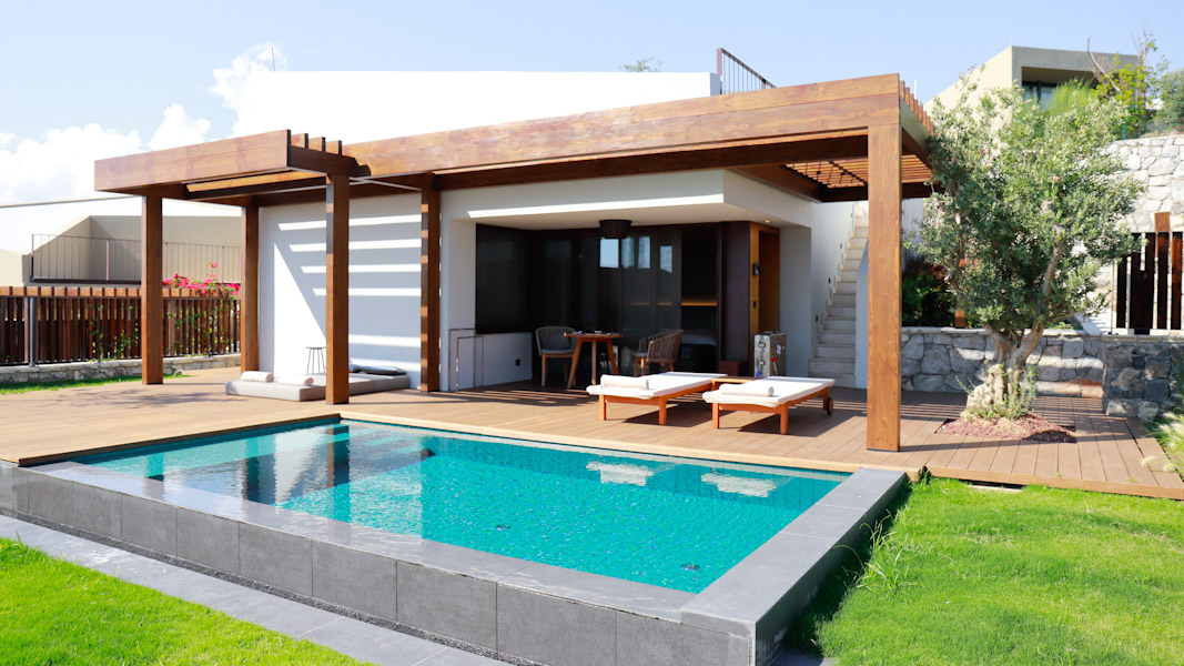 Wunderbar privat sind die Seaview Pool Residences mit einer Größe von 175 oder 185 Quadratmetern. Sie können gemietet werden. Alle verfügen über drei Schafzimmer, einen privaten Garten und einen Pool. Großzügig erstreckt sich der Wohnbereich mit Kamin, Terrasse und einem Dinner Bereich für sechs Personen. Es gibt ein separates Gäste-Bad, eine komplett ausgestattete Küche, Flachbildschirm mit Satellitenfernsehen, ein iPad und high-speed WLAN.