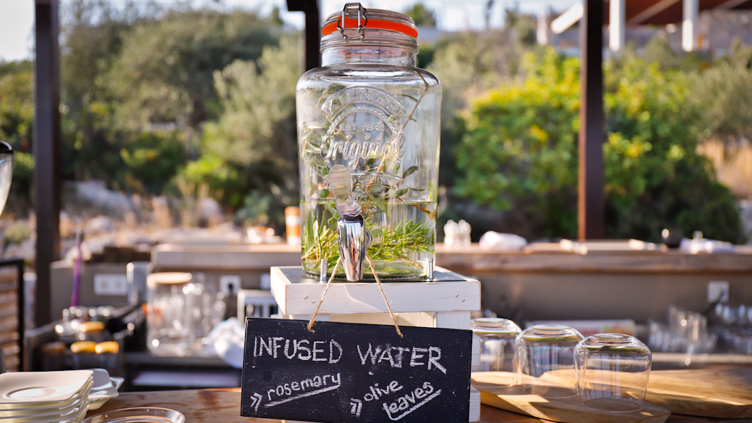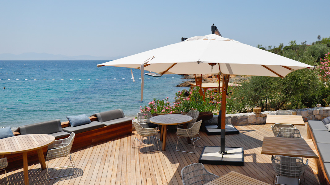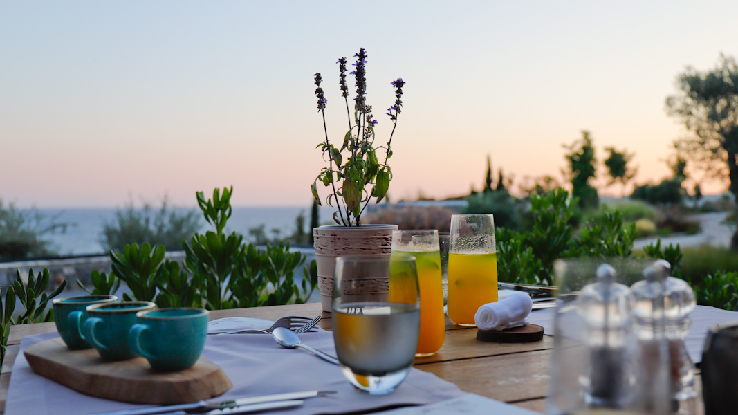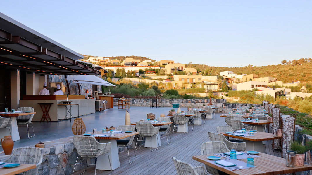 Oberhalb des Pools nur wenige Gehminuten vom Hauptgebäude entfernt finden die Gäste hier das nächste Restaurant mit einem großen offenen Bereich. Serviert werden legere und schnelle Gerichte aus der offenen Küche von der Karte. Das Panorama über die Ägäis ist atemberaubend und besonders zum Sonnenuntergang sehr empfehlenswert. Egal ob ein romantisches Dinner oder ein Cocktail – hier ist die Aussicht ein Hingucker.