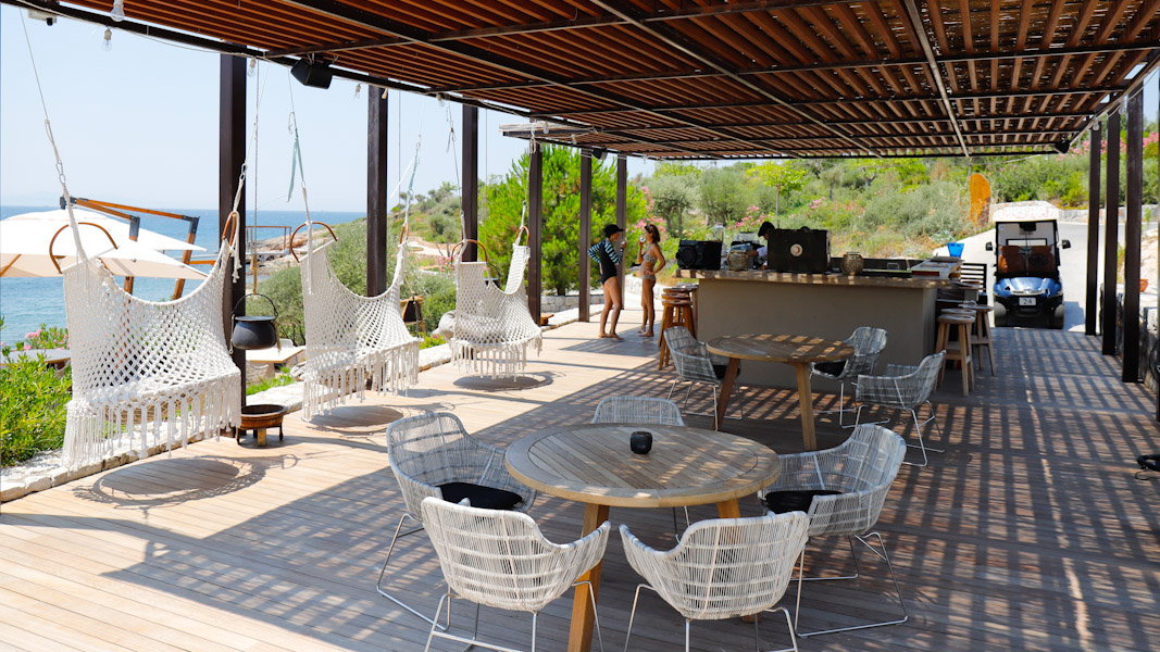 Die Bar befindet sich unmittelbar in der Nähe der Bucht. Hier gibt es kühle Drinks und Snacks mit einer perfekten Aussicht auf die Bucht. Egal ob in einem Hängekissen oder gemütlich am Tisch, die Strandbar lässt sich sehen und verspricht auch gemütliche Abende.