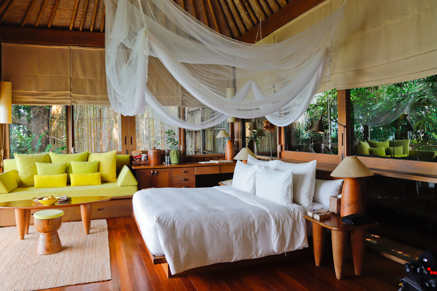 Das Resort verfügt über 66 Villen, wovon die meisten mit einem privaten „Infinity Pool“ ausgestattet sind. Alle Villen sind zweigeschossig und bieten im oberen Stock eine Sonnenterasse und im unteren Zugang zum Swimmingpool. Die Farbakzente Gelb und Grün sind im gesamten Resort durchgängig ein Blickfang. Das einheitliche Design kehrt in den meisten Six Senses Resort wieder und birgt daher keine Überraschungen für den Gast. Die Villen liegen an einem Hang inmitten dichter tropischer Vegetationen bieten damit eine maximale Privatsphäre sowie einen traumhafter Blick auf den Golf von Siam. Die Wohnfläche der Villen liegt, je nach Kategorie, zwischen 130 und 600 Quadratmetern und sind mit viel Liebe zum Detail ausgestattet. Mein Highlight im Six Senses ist jedes Mal das imposante Himmelbett. Groß, gemütlich und mit einem perfekten Blick auf das Meer. Die Villen verfügen zudem ein geräumiges Badezimmer mit einer Outdoor Dusche. Eine Wohlfühloase wie in einem kleinen Dschungel. Die Anlage wirkt groß und so stehen dem Gast auf Wunsch auch Buges zur Verfügung. Nach kurzer Zeit wird man jedoch feststellen, dass die Entfernungen auch einen Spaziergang wert sind.