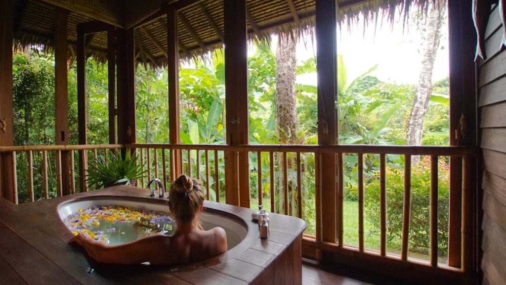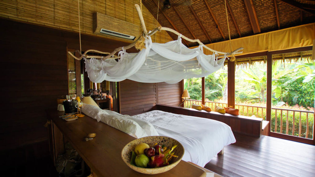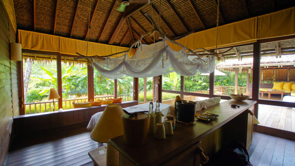 Im inneren der Villa geht es mit dem gemütlichen Holzambiente und den warmen Farben weiter. Alles wirkt groß und trotzdem gemütlich. Die Dekorationen in dem gelben Ton verleihen der Villa das Besondere. Jeden Tag wird frisches Trinkwasser und eine Flasche Kokoswasser mit Raspeln zur Verfügung gestellt. Eine Minibar und ein Weinkühlschrank sind ebenfalls vorhanden. Das Besondere ist der Ausblick aus dem Schlafbereich und dem Badezimmer – hier schaut man von allen Seiten in den tropischen Garten oder zur Seite auf den privaten Poolbereich. Für einen erholsamen Schlaf findet ihr neben dem Bett eine Liste mit verschiedenen Kissen zur Auswahl. Ich persönlich habe hier tief und fest geschlafen und die vorhanden Kissen waren ausreichend genug.