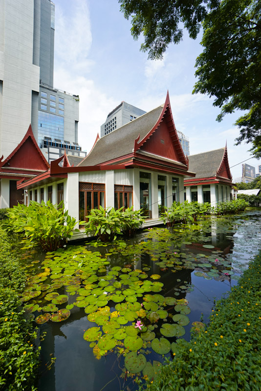 Beim Betreten der 2,5 ha großen, mit Palmen und kleinen Teichen gesäumten Anlage des The Sukhothai fühlt man sich um 750 Jahre in das Goldene Zeitalter Thailands zurückversetzt. Name, Architektur und Ausstattung sind von Sukhothai inspiriert, der ersten Hauptstadt des Königreichs. Teakholzböden, prachtvolle Thaiseide und kostbare historische Kunstgegenstände prägen das von Star Architekt Ed Tuttle (Aman-Resorts) erbaute Hotel. Der flache, labyrinthartige Gebäudekomplex bildet eine angenehme Alternative zu den Wolkenkratzern der Stadt und verzaubert durch Besonderheiten wie den kerzenbeleuchteten Chedi-Brunnen im Zentrum des Hotelkomplexes sowie einem auf einem künstlichem See schwimmenden Restaurant.