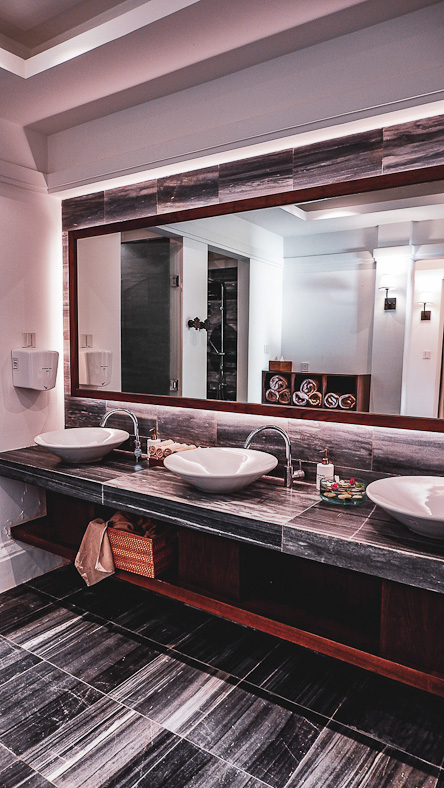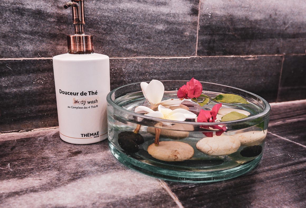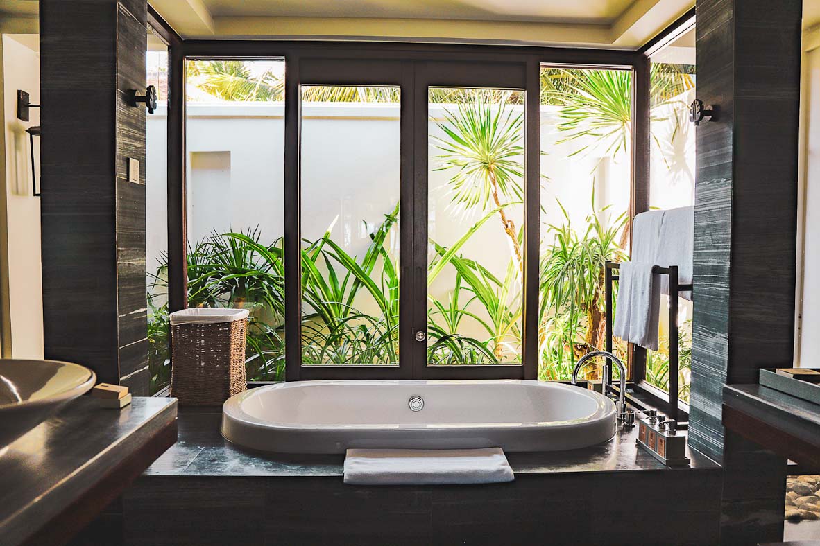 Die Badezimmer sind in elegantem grauen Stein gehalten und mit einer großen Badewanne und Regendusche ausgestattet. In den Villen sind die Bäder zum privaten Garten hin offen.
