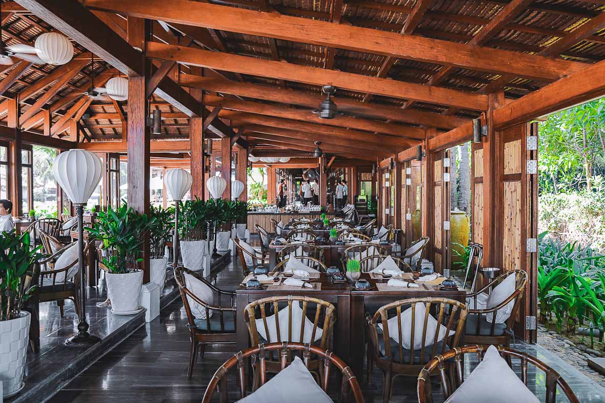 Beim Frühstück im Restaurant Indochine genießen Sie bereits die herrliche Aussicht auf den Ozean. Neben den köstlichen Leckereien am Buffet können Sie sich Ihr Frühstück auch an verschiedene Kochstationen individuell zusammenstellen. Bereits am Morgen werden traditionelle Suppen mit frischen Gewürzen gereicht, die im hauseigenen Kräutergarten gezogen und täglich frisch geerntet werden. Auch das Kokoswasser stammt nahezu ausschließlich von Kokosnüssen aus den hoteleigenen Gärten.